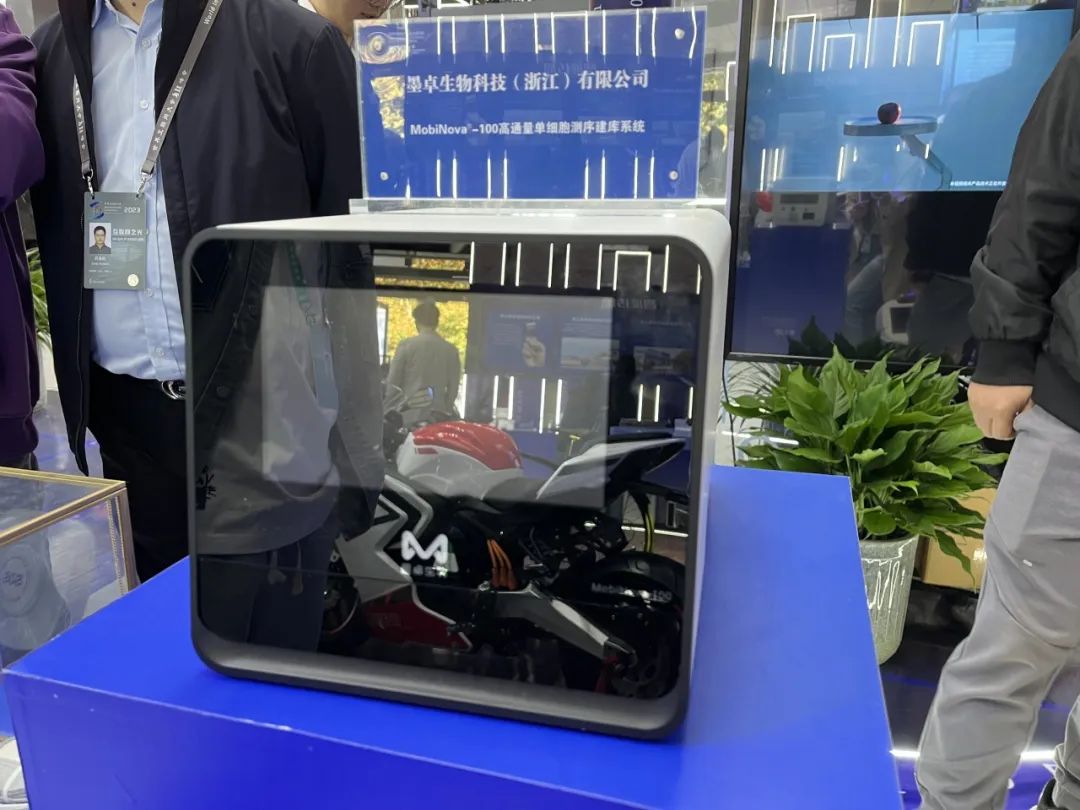 馆内这款来自墨卓生物的核心产品——MobiNova®-100高通量单细胞建库系统,打破了持续多年的国内单细胞测序工具进口垄断局面。产品名字“MobiNova”中的“Mobi”取自英文单词“Mobile”,寓意灵活、轻盈、以及畅流的微液滴;“Nova”在拉丁文里意思为新星,寓意这款产品能像新星般闪亮登场、并持续照亮市场。
