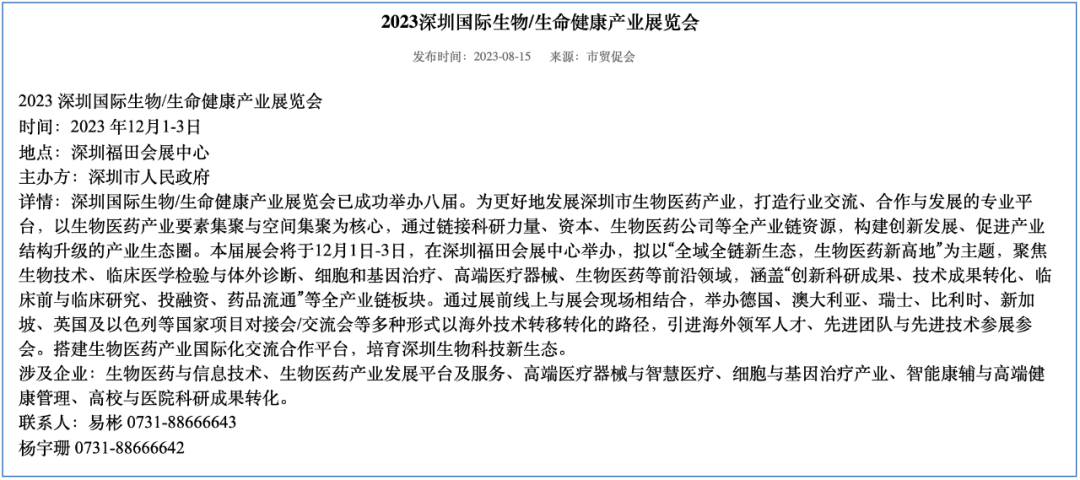 时间:2023年11月25日-27日(周六-周一)参展范围:安徽养老产业综合展区、老年医疗器械、康复设施及辅助用品展区、老年生活用品展区、护理辅具及用品 展区、老年健康食品及功能性食品展区、智慧养老展区、艾灸产业展区、养老机构及老年服务业展区。本次展会通过“医疗、科技、产业、科普”相结合的模式,依托深圳“技术、资本、政策、市场”相融合的产业优势设置了生物医药与信息技术、生物医药产业发展平台及服务、高端医疗器械与智慧医疗、细胞与基因治疗产业、高端健康管理与智能康复辅具、粤港澳大湾区与国际共六大展区。1、保健食品 :国家相关部门批准的 27 种保健功效产品(蓝帽子产品)、营养素补充剂2、进口膳食补充剂、进口健康食品、健康食品/天然食品:绿色食品、有机食品、绿藻产品等;功能饮料及功能水:运动营养饮料、矿物质饮料等。3、特殊医学用途配方食品:全营养配方食品、特定全营养配方食品等。5、美容产品:美容食品、功能性化妆品、胶原蛋白等。6、技术与服务(注册/转让/OEM) :OEM合同定制、媒体、相关协会、管理咨询服务。1、国际品牌展区境外口腔企业;国际知名大品牌企业;拥有国际竞争力、国际优势。2、高新技术展区口腔医疗器械、设备等企业;国家高新技术企业;口腔产品具有国际竞争力。3、民族品牌展区民族品牌口腔企业;拥有自主创新知识产权、器械、设备等厂商。4、数字化展区数字化正畸;数字化种植;牙科3D打印;数字化义齿加工。5、护理感控展区口腔护理产品;电动牙刷;牙科医用灭菌消毒产品;牙科专业医用服饰。6、综合展区口腔器械、影像、软件、耗材;牙科咨询、教育培训、装修设计、经销代理商、协会媒体等服务。时间:2023年12月23日-25日(周六-周一)