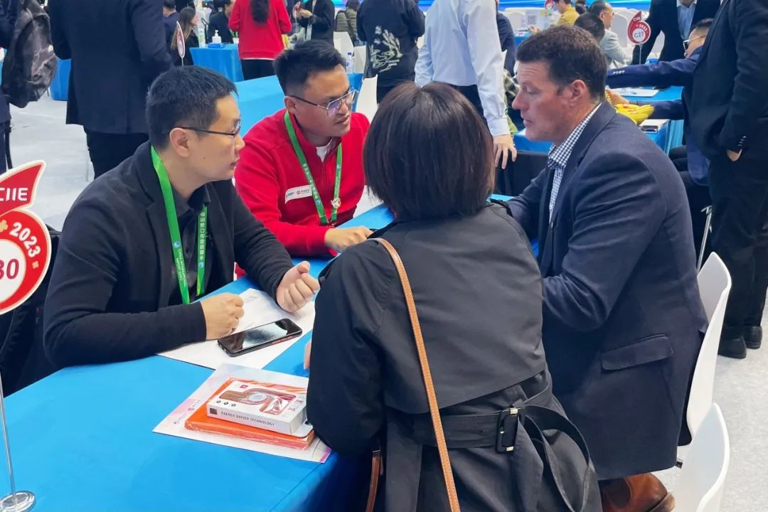 对接会开幕不久,洽谈区A06桌就迎来了第一场撮合活动,来自山东的可颂工厂,希望能够寻找到一些国外的优质原料生产商。作为区域负责人,张升阳按照流程将这名客户的行业信息、产品需求等录入系统,寻找匹配的外商,经过系统的配对,很快一名来自加拿大的牛奶制品工厂代表的信息迅速出现。看到信息后张升阳快速将这名外国客户带到A06桌上。在双方就黄油、脱脂奶粉等展开合作洽谈时,张升阳实时关注会议桌上的洽谈情况,并兼职翻译工作。看着双方围绕商品种类、订单数量、交易价格等热烈讨论,张升阳紧绷的弦也被牵动,直到双方握手的那一刻,他由衷地为客户达成合作而高兴,也为自己“新生红娘”的首单成功而满意。