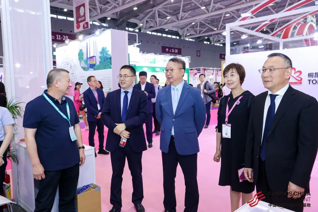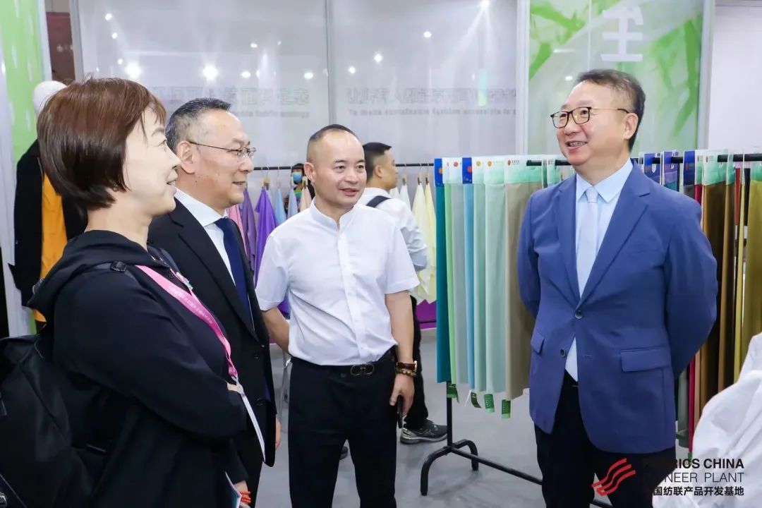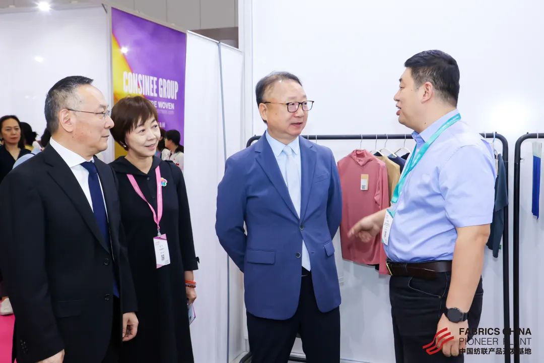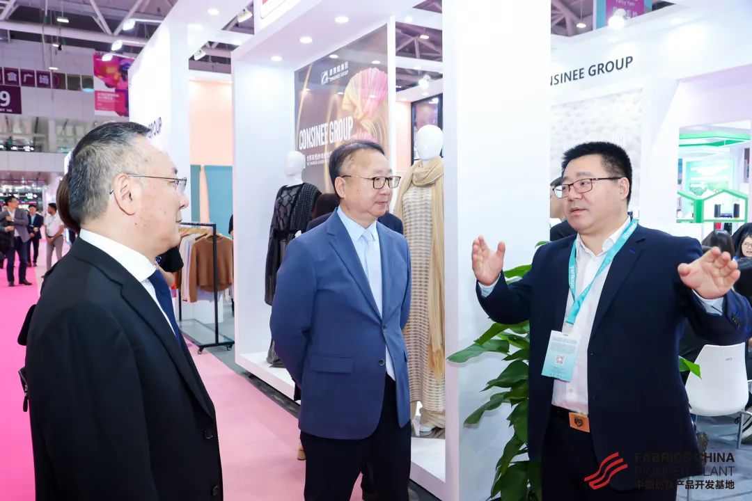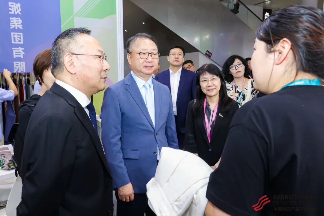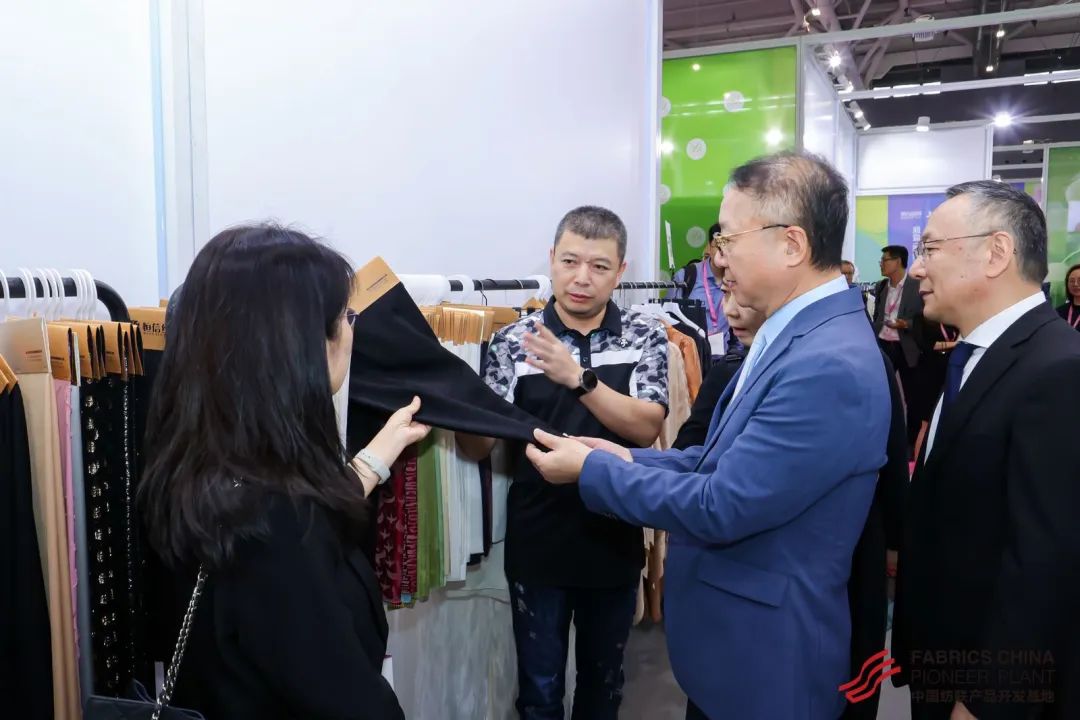 中国纺织工业联合会会长孙瑞哲,中国纺织工业联合会副会长、中国国际贸易促进委员会纺织行业分会会长徐迎新,中国纺织信息中心党委书记、中国纺联社会责任办公室主任阎岩,中国棉纺织行业协会会长董奎勇,国家纺织产品开发中心主任李斌红等领导走访调研了中国纺联产品开发基地企业展位。