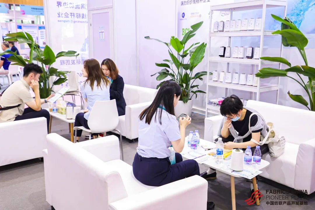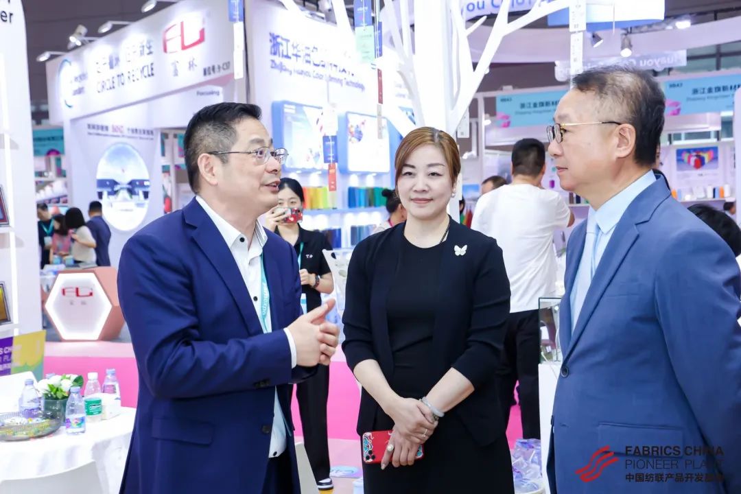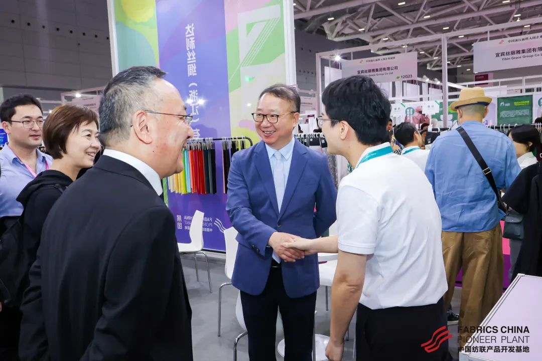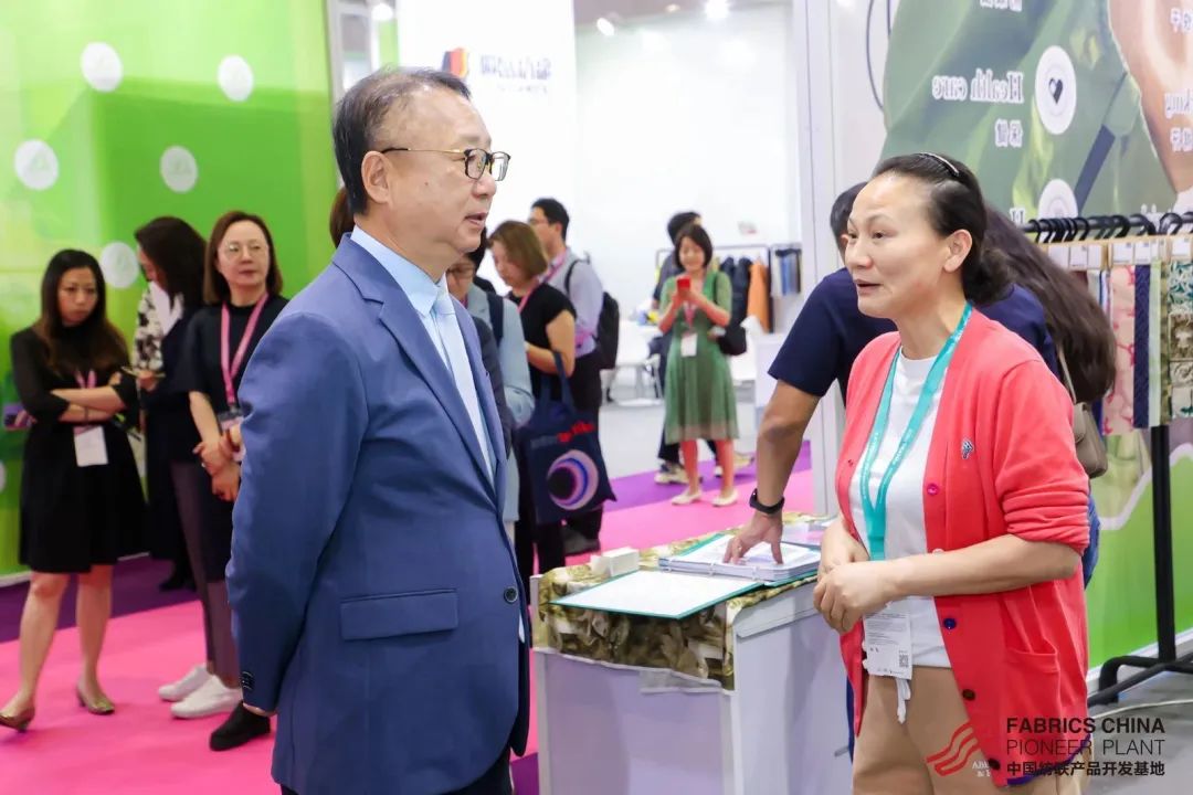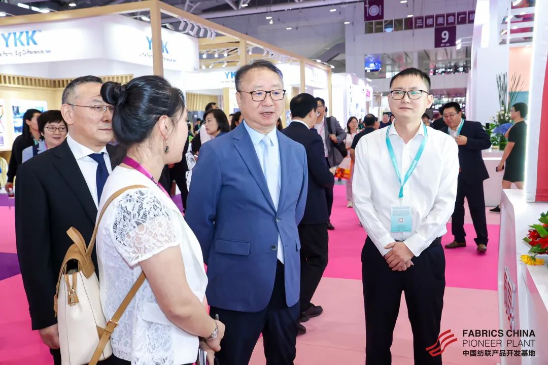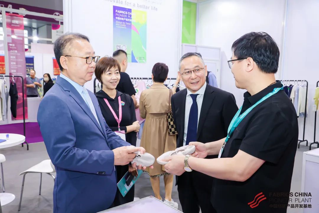 中国纺织工业联合会会长孙瑞哲,中国纺织工业联合会副会长、中国国际贸易促进委员会纺织行业分会会长徐迎新,中国纺织信息中心党委书记、中国纺联社会责任办公室主任阎岩,中国棉纺织行业协会会长董奎勇,国家纺织产品开发中心主任李斌红等领导走访调研了中国纺联产品开发基地企业展位。
