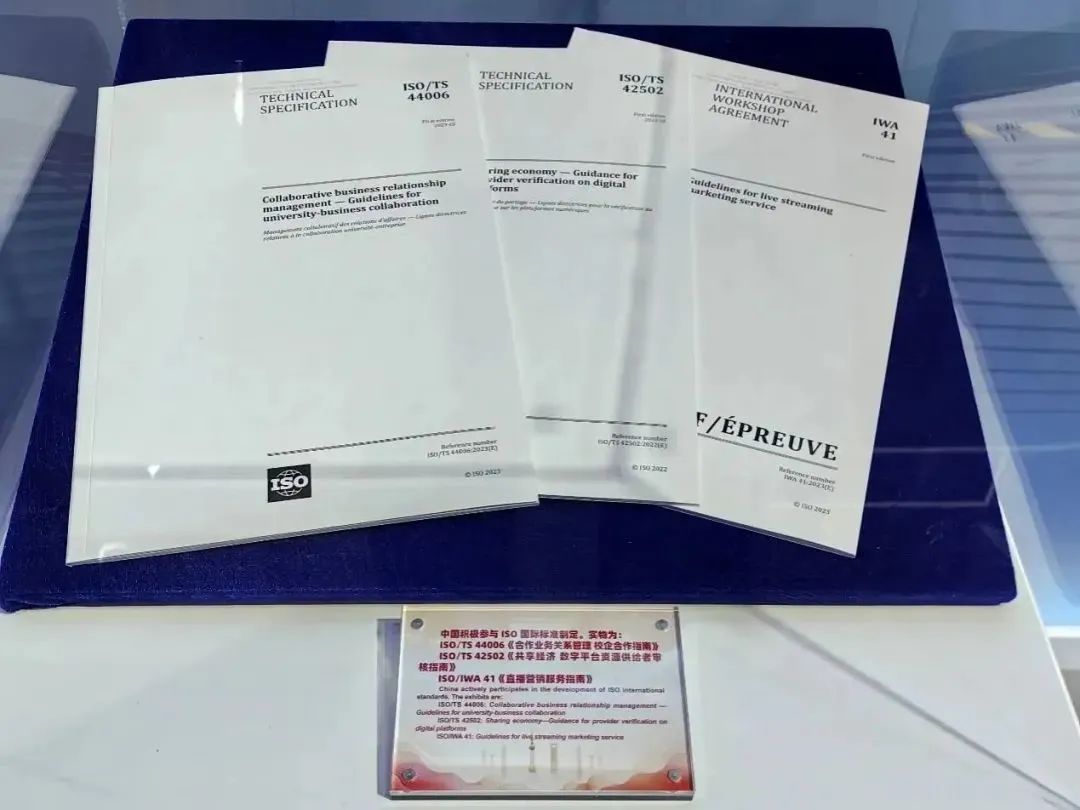 中国贸促会商业行业委员会秘书长、ISO/TS 44006《合作业务关系管理 校企合作指南》、ISO/TS 42502《共享经济 数字平台资源提供者审核指南》和ISO/IWA 41《直播营销服务指南》等三项国际标准研制项目负责人姚歆介绍说,此次是进博会中国馆首次展示中国的国际标准化成果。这三项以实物方式展示的标准均为近年来中国贸促机构参与全球经济治理的最新成果,在多个新兴领域实现零突破的国际标准,特别是ISO/TS 44006和ISO/IWA 41则分别为校企合作和直播营销领域的全球首个国际标准。