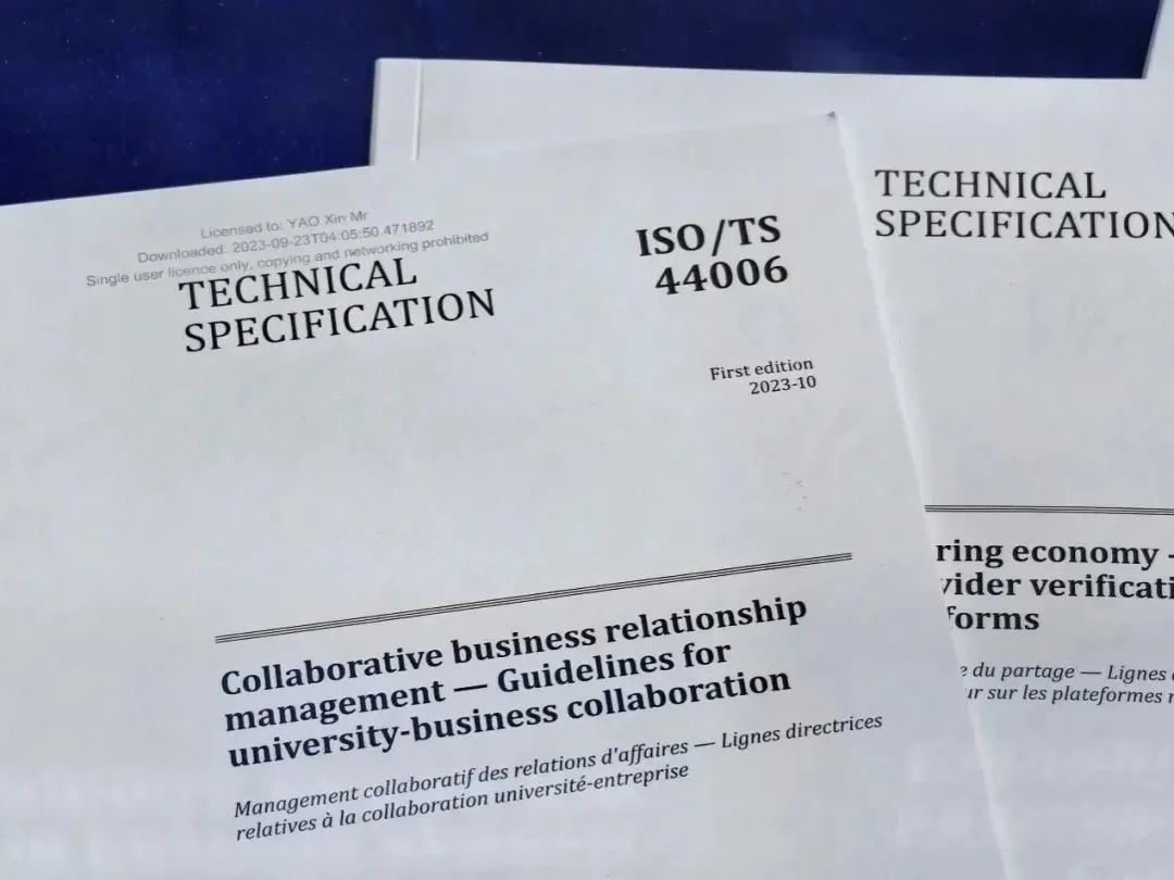 ISO/TS 44006《合作业务关系管理 校企合作指南》国际标准于2023年10月13日发布。该标准为高校、企业及其他相关利益方提供指引,帮助他们运用ISO/TR 44000所规定的合作业务关系的12项原则,以提高高校与企业合作的能力。该国际标准在发布后,曾获得了新华网客户端的相关报道,阅读量突破百万。