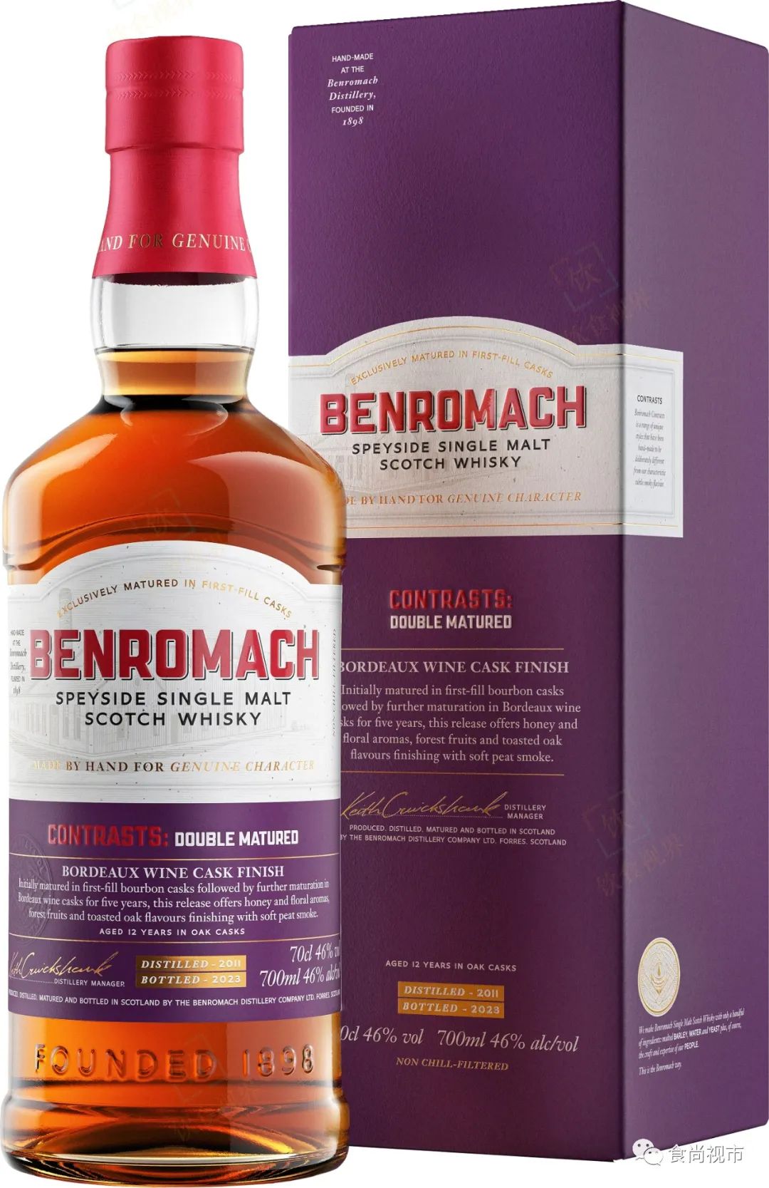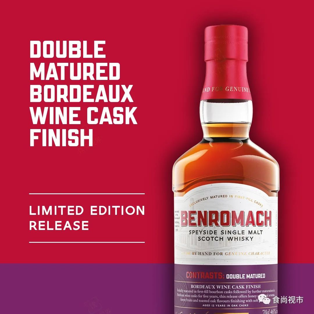 位于苏格兰斯佩塞(Speyside)产区的本诺曼克(Benromach)酒厂创立于1898年,隶属于高登&麦克菲尔(Gordon & MacPhail)集团,曾经是斯佩塞最小的酒厂。 2020年,本诺曼克推出了一个威士忌系列——Contrasts,此系列中的酒款风格与本诺曼克核心风格迥异,款款特立独行,可以算是本诺曼克的一个先锋实验系列,不过本诺曼克同时也表示,此系列中的每款酒,均是由酒厂匠人手工打造,饱含真诚,值得一试。此前此系列已经有7款酒上市(其中有的酒款出过多个批次):Contrasts:Peat Smoke Sherry Cask MaturedContrasts:Triple DistilledContrasts: Kiln Dried Oak 2023年11月06日,本诺曼克正式发布了这款酒,其蒸馏于2011年,先是熟成于初填波本桶(First-Fill Bourbon Casks),然后转入到波尔多葡萄酒桶(Bordeaux Wine Casks)中继续熟成了5年,装瓶于2023年,酒龄为12年,酒精度数为46% ABV,容量为700ml。 先是淡淡的玫瑰花香,随后是蜂蜜和成熟的红色水果香气; 能够感受到柔顺且香甜的柑橘类水果风味,深色森林水果与烘烤橡木风味交织而平衡; 目前这款酒已率先于英国和欧洲上架开售,官方建议零售价为59.99英镑,按现行汇率计算,约合540元人民币。未来这款酒将陆续于全球更多精选零售市场上架开售。如果您感兴趣想尝鲜,且身在英国或欧洲,可以去找找看。我们将继续关注未来动向,如有更多资讯,将及时为大家带来,关注本账号将不会错过。 大家还可以扫描下面的加群二维码,加入饮食视界微信群进行讨论。并欢迎大家观看、关注B站“赵东酒食”(见文末),超多精彩视频和福利活动正在 路上,关注“饮食视界”和“赵东酒食”就不会错过,下一期更精彩!