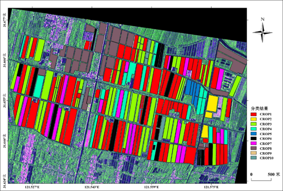 将识别出的各地物信号进行颜色标注,结合光学图或其他农作物矢量文件验证结果。