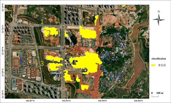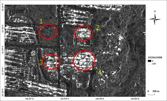 1区在4月28日-5月22日期间SAR图像中信号由高变低,可能原因是该地建筑拆除。 2、3、4区提取出变化图斑,原因可能是这些地方在3月-6月期间存在施工建设的现象。