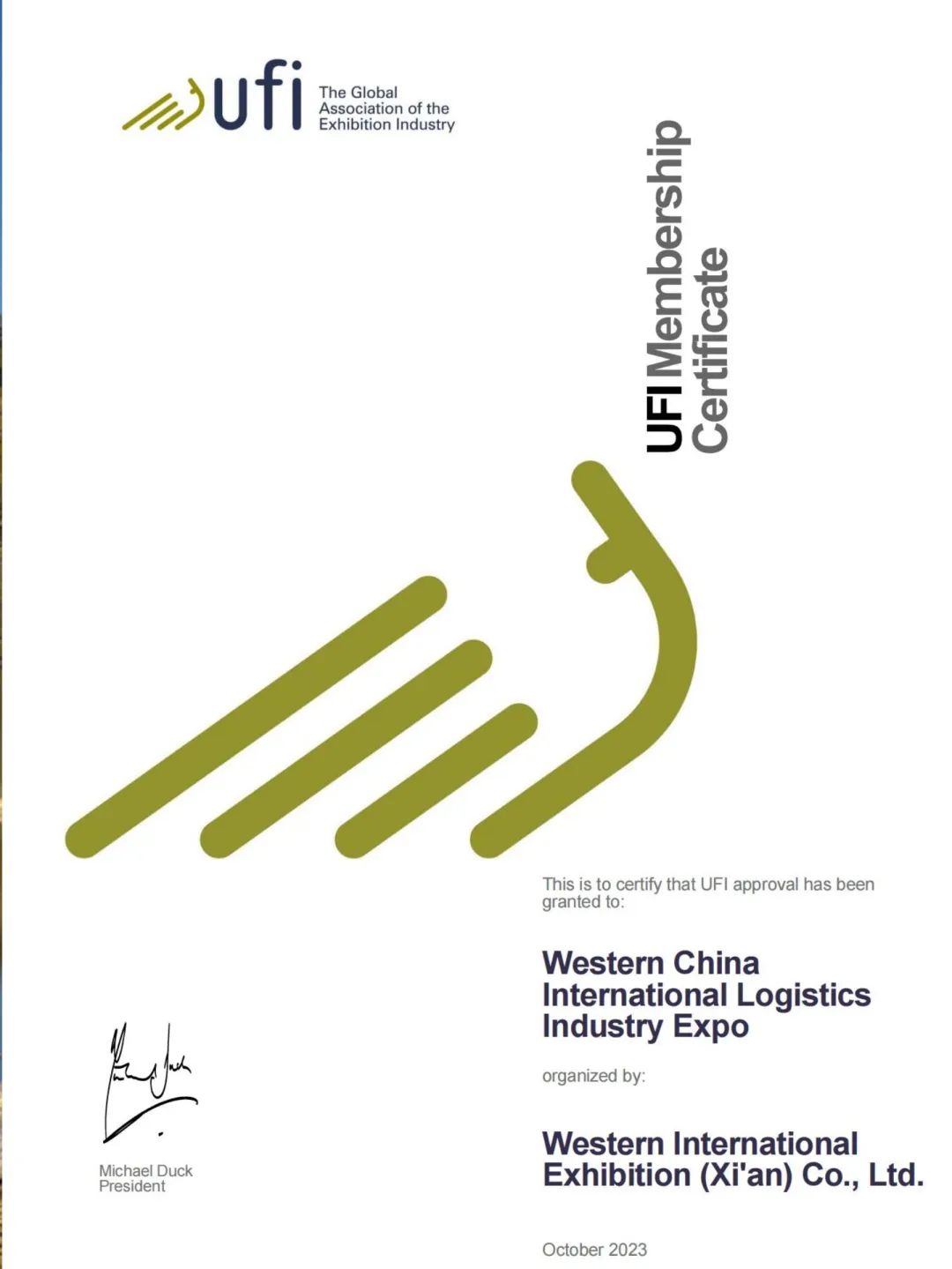 近日,西部国际会展有限公司旗下“中国西部国际物流产业博览会”展会项目成功通过UFI认证,西部国际会展 (西安) 有限公司也正式成为UFI中国成员,标志着西部国际会展公司迈进了国际品牌会展的行列。这也是继品牌价值871.19亿元的“杨凌农高会”2017年首获UFI认证后、陕西省内的第四个国际行业顶级认证。我省2022年在全国UFI认证中处于第15位,一直居西北五省之首。