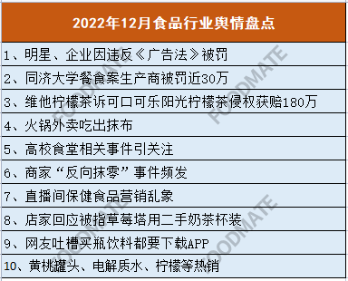 食品伙伴网讯 2022年12月食品行业舆情信息如下: 2022年12月,上海市市场监督管理局公布了两则行政处罚信息,影视演员潘**及上海一家公司因违反《广告法》规定,分别被上海市市场监督管理局罚款约25.8万元、112万元,同时该明星还被没收违法所得约25.8万元。随后,明星因违法代言保健食品广告被罚的相关话题登上热搜。 据悉,2021年3月15日,潘**接受上海一公司委托拍摄了一款保健食品60秒视频和3张平面精修图片用于商业推广。为宣传、推广该产品,2021年6 月8日至2021年7月22 日,该公司先后在抖音、微博、小红书企业账号发布上述60秒视频,在微信公众号发布了推文,该推文配有上述60秒视频和3张平面精修图,且上述发布的视频和推文中均未标明“本品不能代替药物”。 涉事明星以自己的名义和形象为保健食品作推荐和证明的上述行为,违反《中华人民共和国广告法》第十八条第一款第(五) 项“保健品广告不得含有下列内容:……(五)利用广告代言人作推荐、证明。”之规定,构成违法代言广告行为。 上述保健食品广告中,涉事企业利用影视明星潘**的名义和形象对所销售的饮品作推荐、证明,违反《中华人民共和国广告法》第十八条第一款第(五)项“保健品广告不得含有下列内容:……(五)利用广告代言人作推荐、证明。”之规定。企业发布的上述保健食品广告中未显著标明“本品不能代替药物”,违反《中华人民共和国广告法》第十八条第二款“保健食品广告应当显著标明‘本品不能代替药物’。” 之规定。企业发布的上述保健食品广告未经广告审查机关审查,违反《中华人民共和国广告法》第四十六条“发布医疗、 药品、医疗器械、农药、兽药和保健食品广告,以及法律、行政法规规定应当进行审查的其他广告,应当在发布前由有关部门(以下称广告审查机关)对广告内容进行审查;未经审查,不得发布。”之规定。 针对上述事件,2022年12月26日,潘**工作室发布致歉信,称已第一时间终止相关合作,缴清全部罚款,今后绝不会开展任何违反法律法规的产品代言或肖像权合作。潘粤明也转发表示,“非常抱歉给广大消费者带来困扰和不便,我与团队已深刻反省。在日后的工作中,我们会严格要求、规范合作,坚决杜绝此类事件的发生!再次向大家郑重道歉!” 《中华人民共和国广告法》规定,保健食品广告不得利用广告代言人作推荐、证明。此外,市场监管总局等七部门联合印发的《关于进一步规范明星广告代言活动的指导意见》也明确指出,明星不得为保健食品、特殊医学用途配方食品等进行广告代言。不论是保健食品企业还是明星,都需要爱惜自己的羽毛,维护好自身形象,同时,提高法律意识,严守法律法规红线,切勿逾越。 2022年12月,上海一公司因生产经营标注虚假生产日期、保质期或者超过保质期的食品、食品添加剂,被罚近30万。具体违法事由为,当事人生产咸方肉未做原料验收入库记录、生产记录,留样记录、出厂检验记录不全,同时其出厂检验报告审核人员签名为检验员代签;虚假标注生产日期。 上海市松江区市场监督管理局认为,当事人虚假标注生产日期的行为,违反了《中华人民共和国食品安全法》中关于“禁止生产经营下列食品、食品添加剂、食品相关产品:标注虚假生产日期、保质期或者超过保质期的食品、食品添加剂”的规定,构成了生产经营标注虚假生产日期的违法行为。 其次,当事人还存在“未做原料验收入库记录、生产记录,留样记录,且出厂检验代签名”的行为,违反了《中华人民共和国食品安全法》的“食品生产企业应当就下列事项制定并实施控制要求,保证所生产的食品符合食品安全标准:原料采购、原料验收、投料等原料控制;原料检验、半成品检验、成品出厂检验等检验控制”的规定,构成了生产经营过程记录不全的违法行为。 据悉,2022年4月底,有学生反映同济大学餐食出现质量问题(咸猪肉疑似有寄生虫卵),事件一经发出,引发广泛关注。2022年5月4日,上海市市场监管局发布情况通报称,发现咸猪肉的生产企业上海**食品有限公司涉嫌存在虚假标注生产日期、未记录生产记录等违法行为,已对其立案调查。 食品安全问题是企业不能触碰的底线。作为生产企业,需要严格落实食品安全主体责任,加强企业自律,建立健全食品安全管理制度,严把食品安全关。监管部门需要加强监管,加大检查力度,从严从重从快查处食品安全违法行为。 3、维他柠檬茶诉可口可乐阳光柠檬茶侵权获赔180万 2022年12月,维他柠檬茶诉可口可乐侵权获赔180万元一事引起关注。 据悉,可口可乐装瓶商管理服务(上海)有限公司、可口可乐装瓶商生产(东莞)有限公司等与维他奶(上海)有限公司侵害商标权纠纷二审文书公开。 文书显示,一审原告维他奶公司诉称,可口可乐上海公司、可口可乐东莞公司、太古可口可乐公司、棠汇公司四被告侵犯维他奶公司第15252796号商标权,请求法院判令四被告立即停生产、销售、推广宣传阳光柠檬茶(PET)产品;销毁库存涉案产品及宣传材料并赔偿其经济损失及合理费用350万元。 一审法院审理认为,被控侵权阳光柠檬茶产品使用的柠檬片图案标识与维他奶公司主张的维他柠檬茶相关商标构成相似,可口可乐三公司作为知名饮品相关企业,在相同饮品上使用与维他奶公司商标相似的标识,主观恶意明显。最终,一审法院判决可