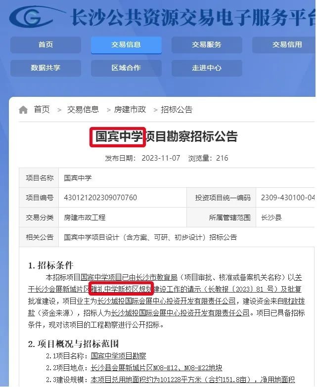 见于公开官方媒体报道or政府网站招标的确切消息,终于在2023年11月7日来了。如图:这是长沙官方招标网站,行文中“国宾中学”是一个规划名称,指的正是“雅礼中学新校区”。至此,算是第一次正式对外官宣,雅礼中学本部“一校两址”新校区落定会展新城。特别注意,这指的是高中部,另有初中小学并未列出。在规划图中位置如下:看上图你就知道,会展新城规划高大上,好地方,只是在过去一两年中缺乏重大的利好,很多关心会展发展、买了会展新城房子的老铁们望眼欲穿,现在,总算来了一个重大利好。雅礼新校区落定会展,因这是市区的高中部,坐落在长沙县境内,不大可能只面向市区招生,所以背后潜藏的意义是会展板块学制问题有望解决。