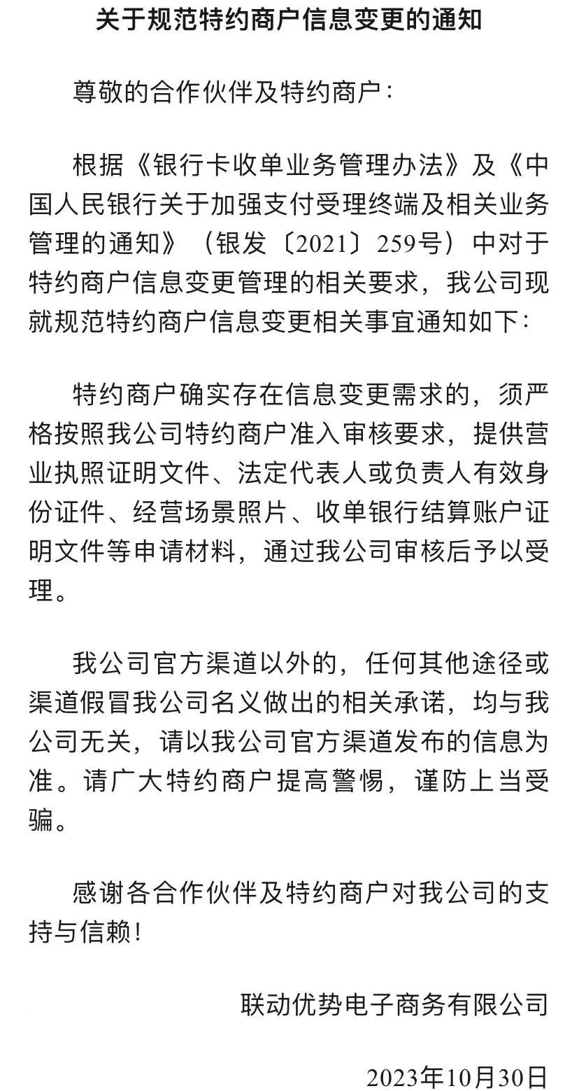 (一)10月30日起,针对确实存在信息变更需求的商户,须严格按照要求通过在线客服(或拨打客服热线:0755-26339288)提供包括但不限于:营业执照信息、门店场景信息、租赁信息、法人信息、结算信息等申请材料,证件及材料信息须通过人工核验后予以受理。特约商户确实存在信息变更需求的,须严格按照我公司特约商户准入审核要求,提供营业执照证明文件、法定代表人或负责人有效身份证件、经营场景照片、收单银行结算账户证明文件等申请材料,通过我公司审核后予以受理。为进一步加强和规范各合作服务商、特约商户的行为,现就相关规范事项进一步通知如下:一、各合作服务商须在依法合规的前提下,规范采集和报送商户资料及信息。特约商户向我司提交的入网信息及相关材料审核通过后,原则上不得再次变更相关注册信息,如特约商户确有需要更改的,应按要求提交营业执照、门店照片、租赁协议等充分证明材料,经审核通过后方可变更。严禁合作服务商或特约商户出现虚假申请、恶意变更商户信息的情形。为持续巩固合规改造成效,保持合规经营发展,再次就相关事项进行如下告知:1、钱宝科技将持续严格落实商户管理要求:新增商户必须提供门头照、经营照,辅助入网材料等资料。存量商户若变更结算账户、装机地址、经营场所等核心信息,除必要核实资料外,需提交2张以上经营场所照片。请各合作服务机构根据此要求,开展后续商户推荐、信息变更,商户维护等工作;1.各合作伙伴、特约商户应持续践行合规经营,必须严格遵守259号文的规定,全力配合我公司做好支付受理终端及相关业务的管理工作。特别是要加强对商户资料的真实性、完整性的审核,确保提交的所有资料真实、有效。特约商户资料或信息有变动需求时,应及时通过我公司提供的渠道提交变更申请,并提供相关证明材料,我公司将根据相关规定和要求,及时处理商户的变更申请。