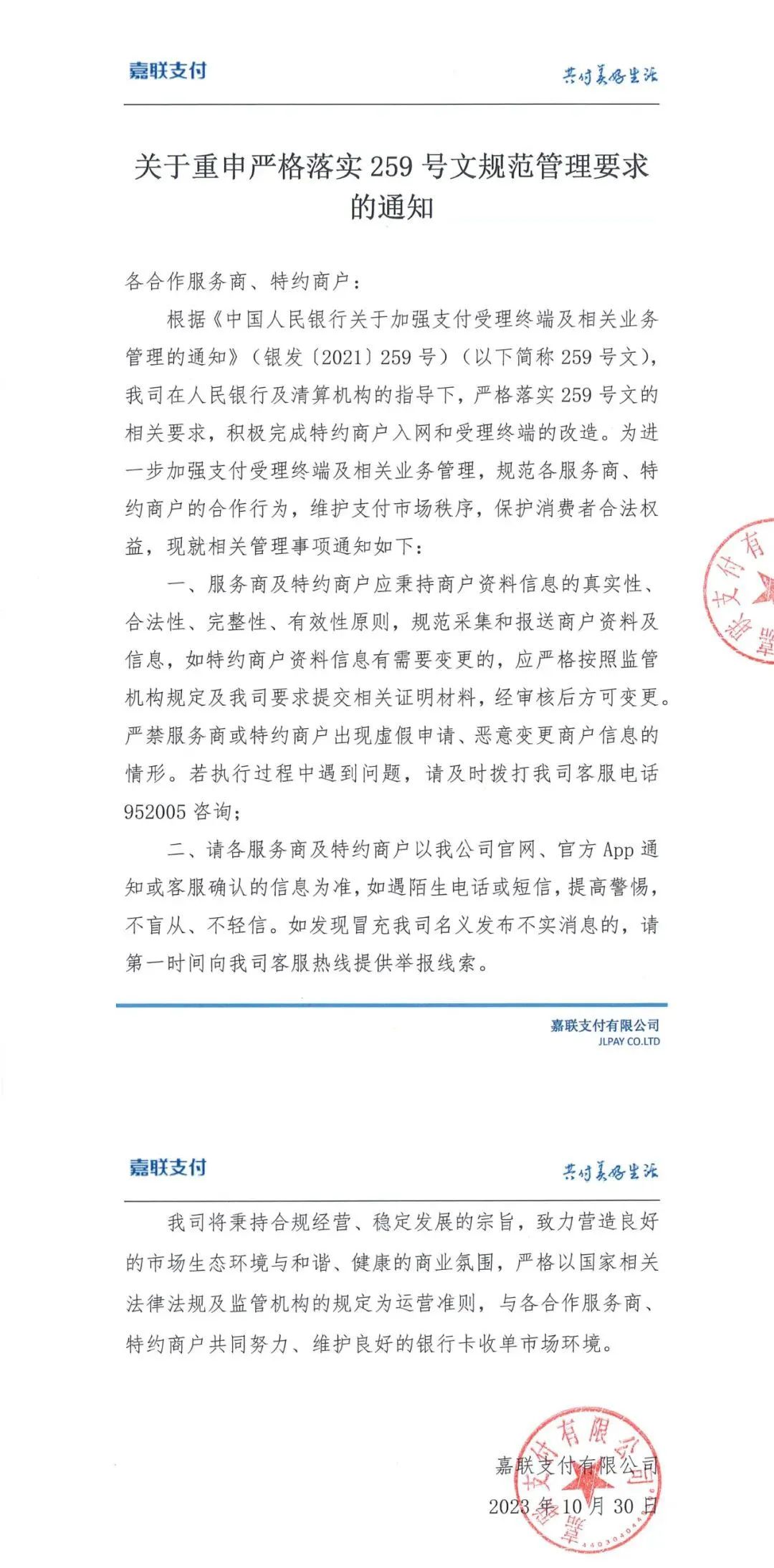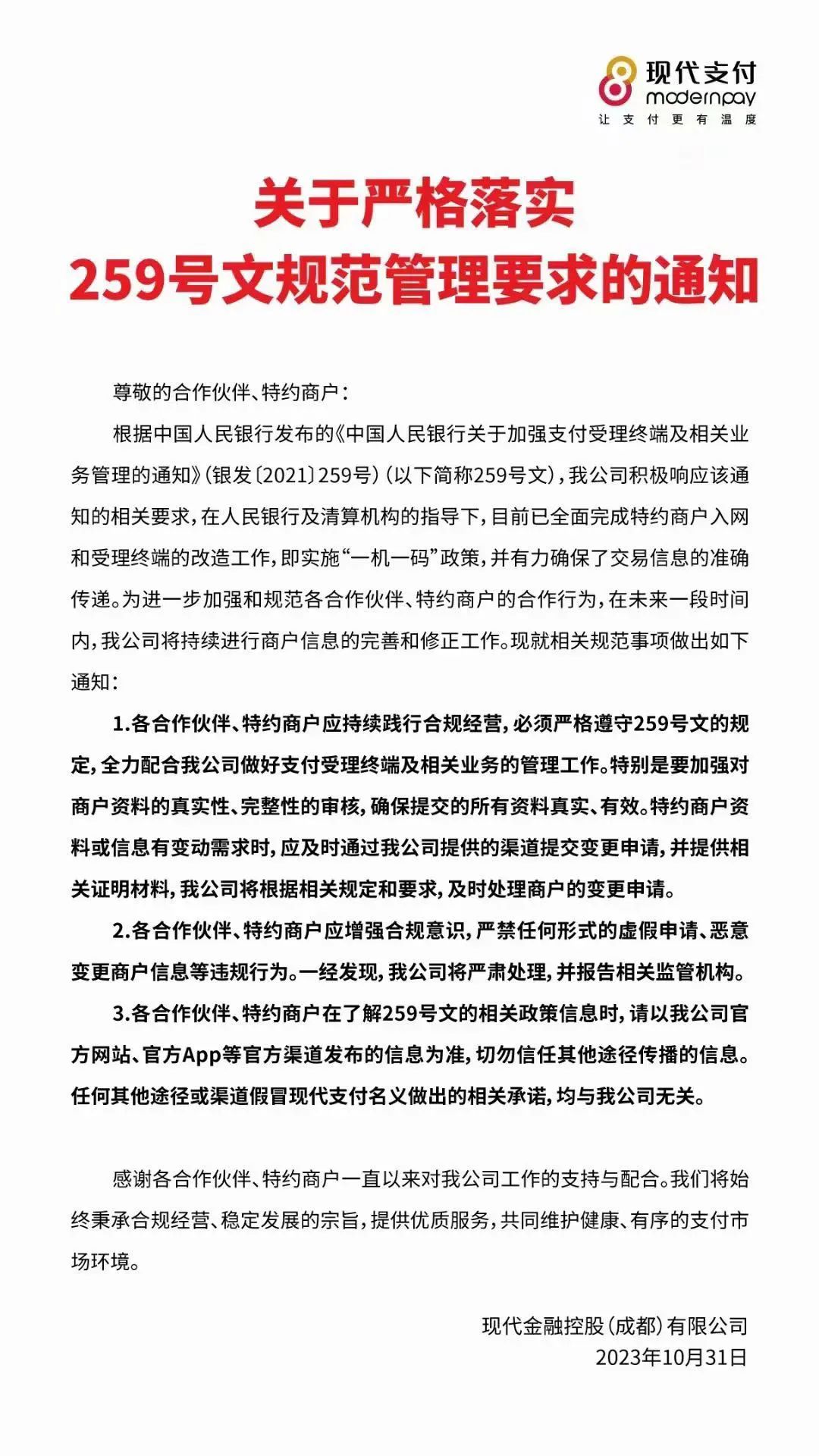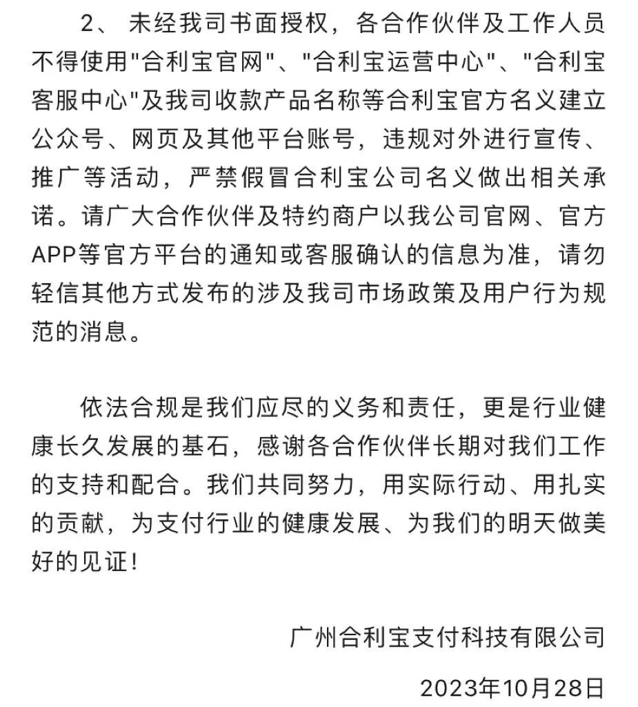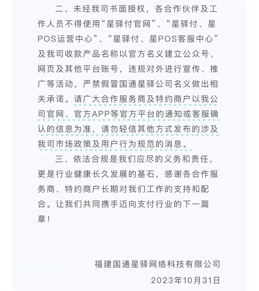 2.各合作伙伴、特约商户应增强合规意识,严禁任何形式的虚假申请、恶意变更商户信息等违规行为。一经发现,我公司将严肃处理,并报告相关监管机构。