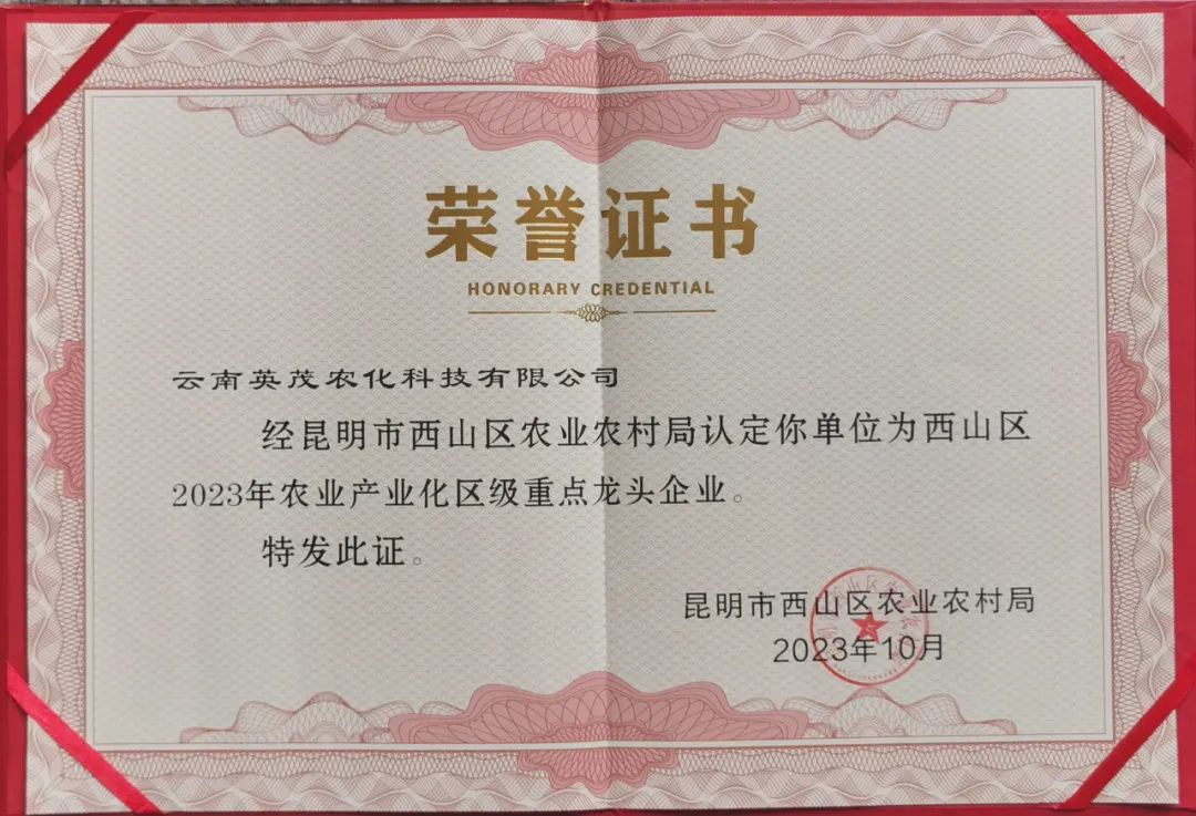 近日,经昆明市西山区农业农村局审查和认定,云南英茂农化科技有限公司荣获“西山区2023年农业产业化区级重点龙头企业”荣誉称号。
