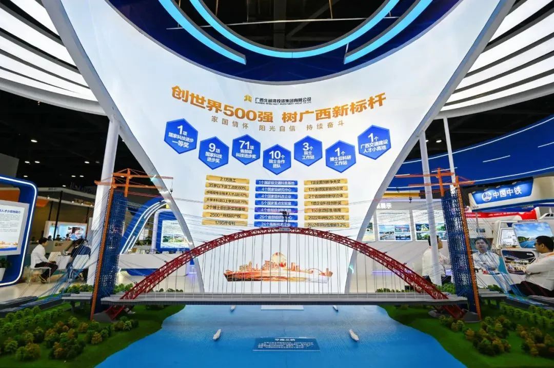广西北部湾投资集团有限公司展厅以“创世界500强 树广西新标杆”为主题,向公众展示推介了企业的改革发展成就、人才培养和科技创新成果,以及新的“北投梦”。展厅通过“世界第一拱”平南三桥沙盘模型及相关数据、实体样品展示,宣传了北投集团最核心的人才科技竞争优势、广西交通建设人才小高地成果、科研投入以及在东盟市场开拓开发等情况,充分展示了北投集团雄厚的人才科技实力和良好的发展前景。