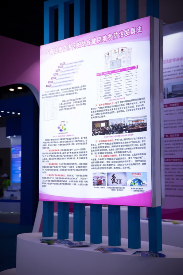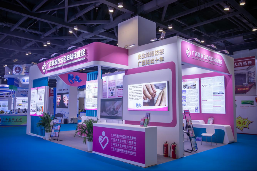 广西壮族自治区妇幼保健院以“出生缺陷防控 广西妇幼十年”为主题,采用粉色搭配蓝色的简约通透设计为主基调,打造了一个既与大会主题相融,又别具生动温馨的独立展区。展区依托丰富的图片、详实的数据、真实的事例以及专家现场讲解等多种形式,通过重点介绍广西出生缺陷防控取得的成绩,呈现了自治区妇幼保健院在护航生命起点健康上所作出的不懈努力,充分展示其近十年来在医疗技术、科研成果、学科建设和人才引育等方面的显著成效和高质量发展的丰硕成果。