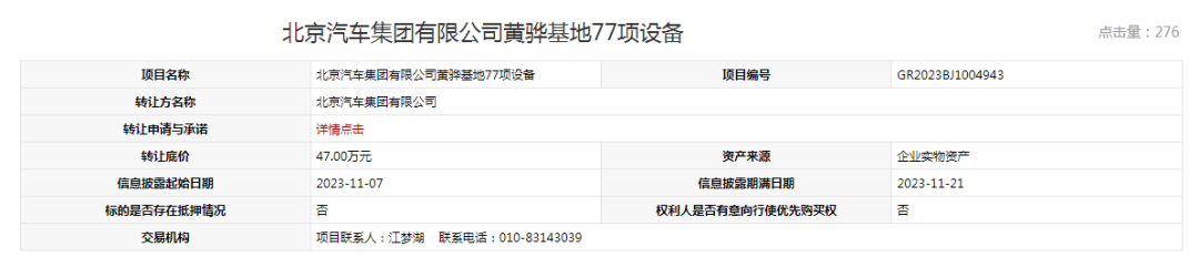 项目名称:北京汽车集团有限公司黄骅基地77项设备;1、意向受让方应在成为受让方后10个工作日内与转让方签署《实物资产交易合同》,并于合同生效后5个工作日内一次性付清全部成交价款(已经支付的交易保证金可转为成交价款的一部分)及交易服务费至北京产权交易所指定账户(以到账时间为准)。同时另行交纳20万元拆运保证金至转让方指定账户(以到账时间为准)。 2、受让方未按约定支付成交价款、交易服务费和拆运保证金的,转让方有权终结本项目交易,受让方已付交易保证金将被扣除并先行支付交易服务费,剩余部分作为对转让方的赔偿金,转让方有权另行处置标的资产。3、受让方应于付清全部款项后10个工作日内凭有效身份证明及《动态报价结果通知书》与转让方进行标的资产的确认、交接工作,签署《资产移交确认书》,《资产移交确认书》签署后标的资产的所有权及风险转移至受让方,转让方不负责保管及其他责任。 4、受让方应于签署《资产移交确认书》后5个工作日内将全部资产清运完毕。受让方未按转让方要求清运完毕的,转让方有权将标的资产移出原有场地另行存放,运输及存放费用由受让方承担。 5、受让方应自行拆除、运输标的资产,所产生的费用由受让方承担。如因受让方原因造成转让方、受让方或其他任何第三方人身损害或财产损失的,由受让方承担全部赔偿责任。标的资产拆除、运输过程中,受让方应遵守转让方及存放地的规章、制度,服从转让方及存放地的管理,按转让方清运时限要求完成标的资产的清运。清运时由受让方引起的安全、消防、环保等事故由受让方负责。受让方在清运过程中不得破坏存放地墙体、路面和周围设备设施。受让方在标的资产清运完毕后,要求达到场平地净。6、本项目受让方按照成交金额的5%交纳交易服务费。批准文件名称:北京汽车集团有限公司总经理办公会会议纪要第33号 与转让相关的其他条件 1、意向受让方应在成为受让方后10个工作日内与转让方签署《实物资产交易合同》,并于合同生效后5个工作日内一次性付清全部成交价款(已经支付的交易保证金可转为成交价款的一部分)及交易服务费至北京产权交易所指定账户(以到账时间为准)。同时另行交纳20万元拆运保证金至转让方指定账户(以到账时间为准)。2、受让方未按约定支付成交价款、交易服务费和拆运保证金的,转让方有权终结本项目交易,受让方已付交易保证金将被扣除并先行支付交易服务费,剩余部分作为对转让方的赔偿金,转让方有权另行处置标的资产。3、受让方应于付清全部款项后10个工作日内凭有效身份证明及《动态报价结果通知书》与转让方进行标的资产的确认、交接工作,签署《资产移交确认书》,《资产移交确认书》签署后标的资产的所有权及风险转移至受让方,转让方不负责保管及其他责任。4、受让方应于签署《资产移交确认书》后5个工作日内将全部资产清运完毕。受让方未按转让方要求清运完毕的,转让方有权将标的资产移出原有场地另行存放,运输及存放费用由受让方承担。5、受让方应自行拆除、运输标的资产,所产生的费用由受让方承担。如因受让方原因造成转让方、受让方或其他任何第三方人身损害或财产损失的,由受让方承担全部赔偿责任。标的资产拆除、运输过程中,受让方应遵守转让方及存放地的规章、制度,服从转让方及存放地的管理,按转让方清运时限要求完成标的资产的清运。清运时由受让方引起的安全、消防、环保等事故由受让方负责。受让方在清运过程中不得破坏存放地墙体、路面和周围设备设施。受让方在标的资产清运完毕后,要求达到场平地净。6、本项目受让方按照成交金额的5%交纳交易服务费。踏勘安排:意向受让方在信息公告期间应自行对标的资产进行全面了解,意向受让方须严格遵守标的所在地现场踏勘有关规定;踏勘时间:项目公示期间的工作日;联系人:王紫,联系电话:010-56636687(需提前电话预约)。各意向受让方由转让方统一组织现场踏勘,其它时间转让方不再另行组织。意向受让方一经交纳交易保证金即表示对标的资产瑕疵及数量、现状认可,成交后不得以任何借口退回标的资产或拒付成交价款及服务费。现场踏勘时应遵守转让方相关规定。其他需要披露的内容:1、转让方不保证本次转让资产的完整性及品质,均以现场实物踏勘现状为准,意向受让方应在预展期间对转让方指认的标的资产进行验核确认,认真了解标的资产状况及瑕疵,位于现场的公示清单以外的实物资产不在本次转让范围内。转让方不负责技术质量保证,不承担售后服务。信息披露及评估报告所载重量及照片仅供参考,请各意向受让方谨慎参与报价。2、本项目以资产现状转让,本项目所涉及的资产评估报告所载重量仅为转让底价的作价依据,不作为本项目的交割依据。3、本次转让价格为不含增值税价,税款由受让方另行承担。交纳截止时间:信息披露公告截止日的17时(以到账时间为准) 如意向受让方存在以下任何一种情形,转让方有权扣除该意向受让方的全部保证金作为补偿:①意向受让方交纳交易保证金后单方撤回受让申请的;②在竞价过程中以挂牌价格为起始价格,各意向受让方均不报价的;③意向受让方存在影响正常转让、竞价公正性或其它违反转让、竞价程序要求的情形的;④