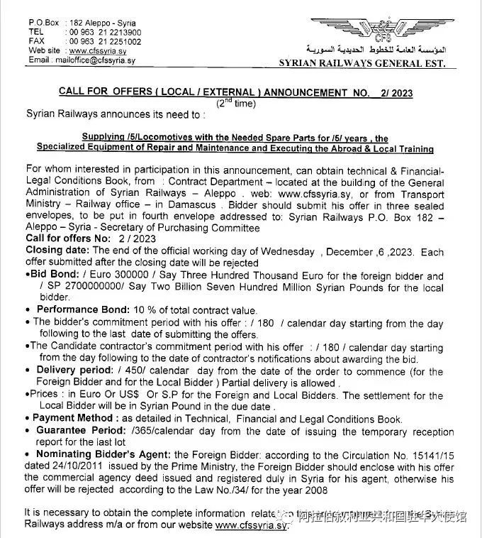 阿拉伯叙利亚共和国驻华大使馆很荣幸地通知相关公司,叙利亚铁路公司对外发布了一份招标文件,该部门欲采购5辆铁路机车,以及相关备件。
