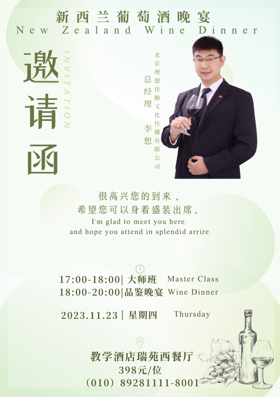 在2023年11月23日,一场专业的品鉴会将在教学酒店瑞苑西餐厅拉开帷幕,这是一场专门为品鉴新西兰美酒而精心策划的活动。我们非常荣幸地邀请到了业界顶级葡萄酒专家李想老师与您共同分享和品鉴新西兰的美酒佳酿。