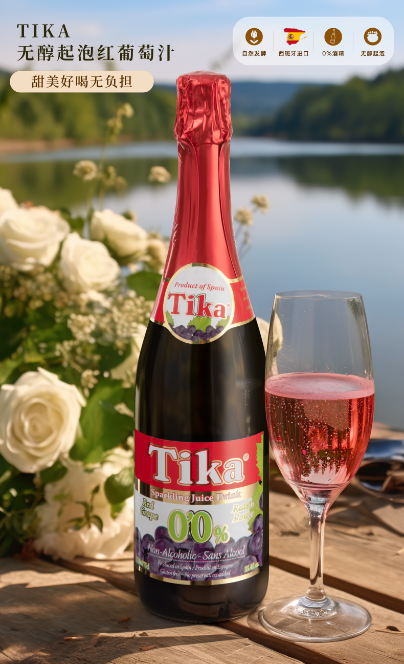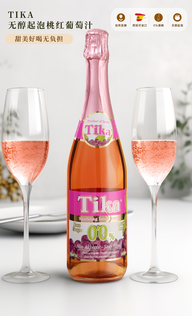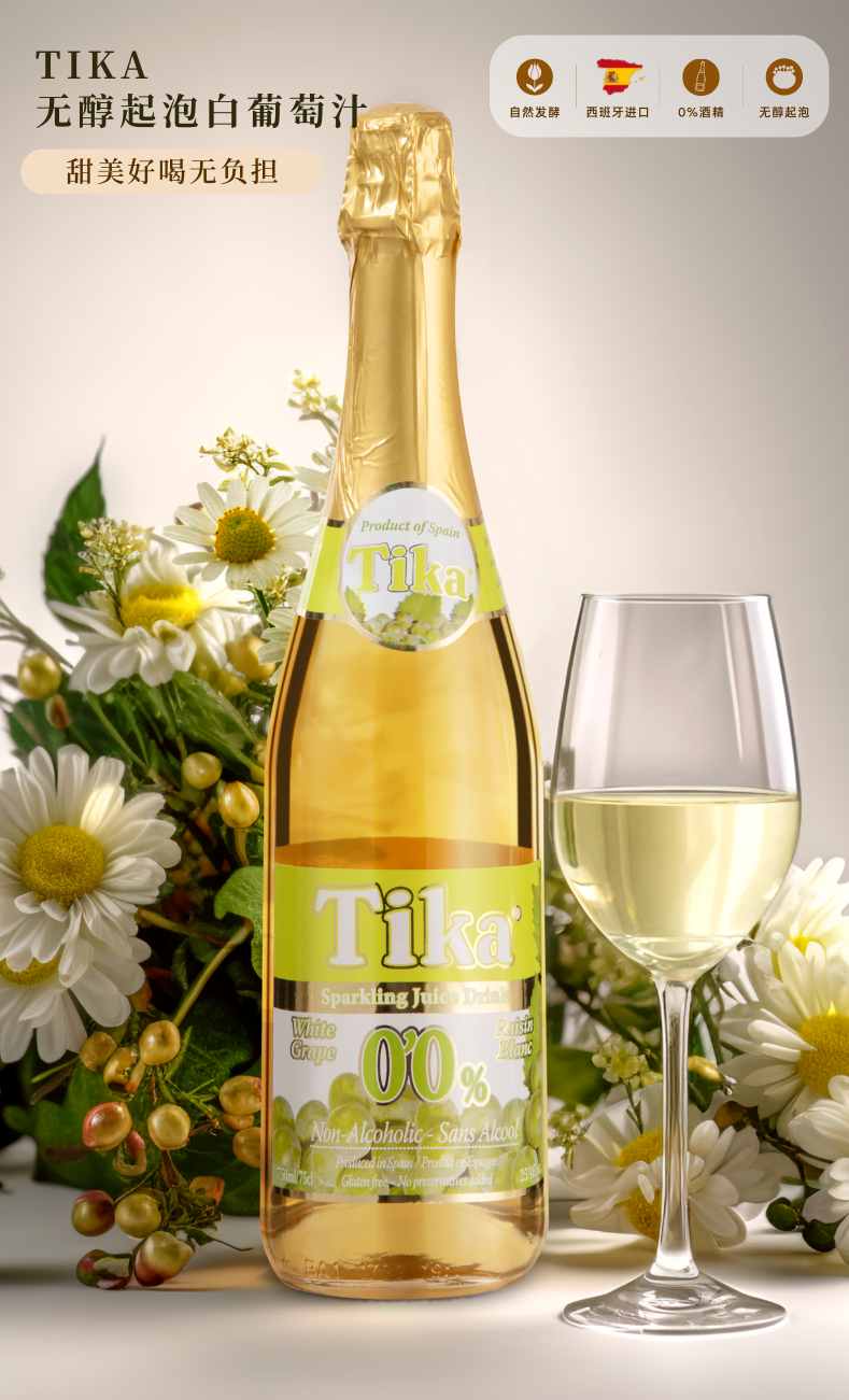 TIKA系列是我司与西班牙PROEX集团合作推出的受年轻人喜爱的起泡酒。这款零度无醇葡萄汁适合大众口味,充满果香,冰镇饮用更令人心旷神怡,佐餐西餐和甜品,能更加体现食物的风味。无醇无酒精,男女老少均可饮用,适合更多场合。