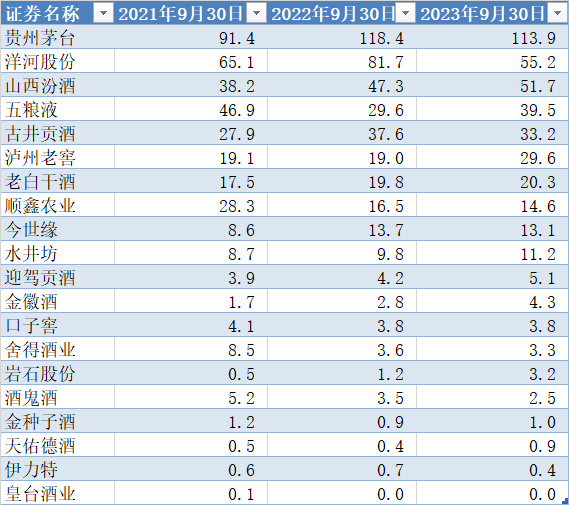 据统计,今年9月30日,A股20家白酒公司合同负债总计406.7亿元,较上年同期414.6亿元下降1.91%。9月末,茅台合同负债金额113.95亿元,较上年同期118.37亿元,减少3.7%;古井贡酒合同负债从37.6亿元降至33.2亿元。