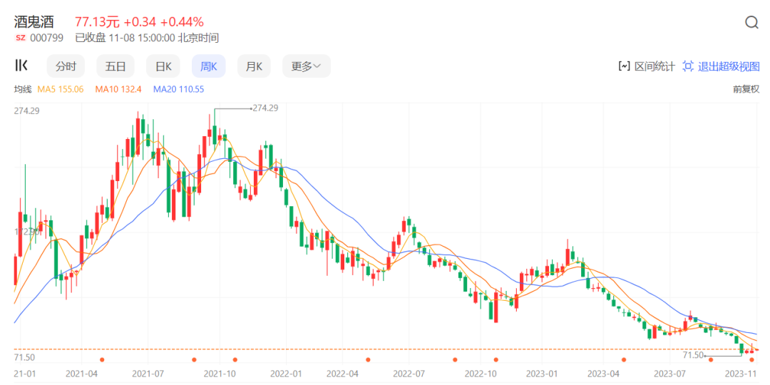 当然,对于酒鬼酒合同负债下降,分析师认为这是酒鬼酒主动帮助渠道去化库存、未向渠道压货。然而,资本市场的态度却毫不含糊:酒鬼酒的股价从274元左右(前复权)的高点跌到如今只剩零头。11月8日,酒鬼酒收于77.13元。