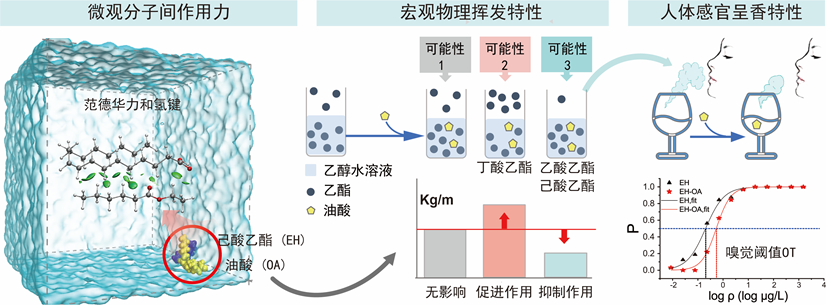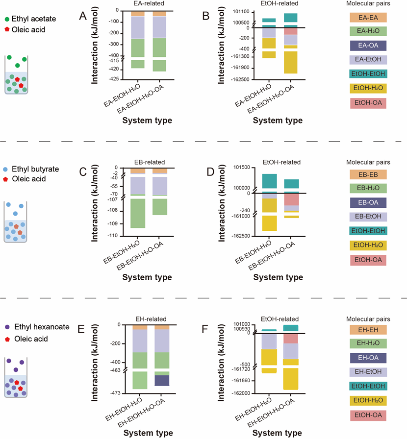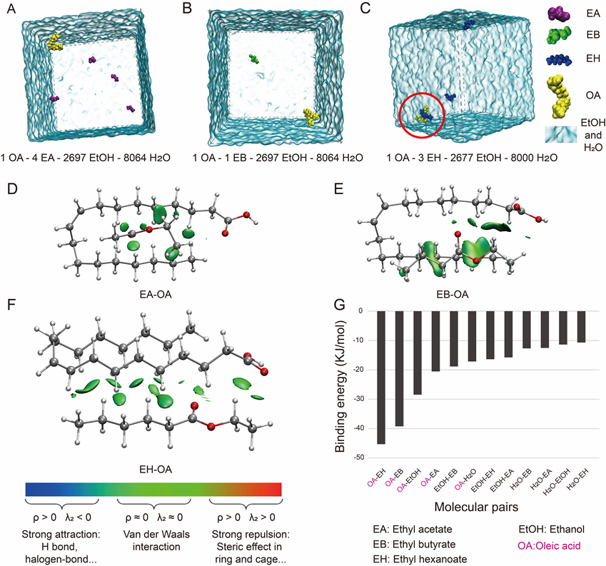 分子动力学模拟和量子化学计算发现,乙酸乙酯、己酸乙酯、乙醇和其他分子间的吸引力因油酸的添加而增强;丁酸乙酯则刚好相反
