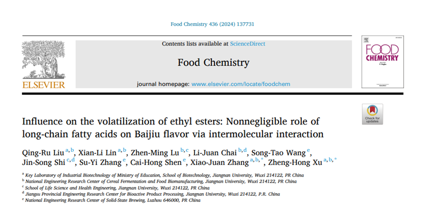 2023年10月,江南大学许正宏教授团队联合泸州老窖国家固态酿造工程技术研究中心沈才洪主任团队在国际食品Top期刊《Food Chemistry》(Q1,IF: 8.8)发表题为“Influence on the volatilization of ethyl esters: nonnegligible role of long-chain fatty acids on Baijiu flavor via intermolecular interaction”的研究性论文。江南大学生物工程学院博士刘青茹为第一作者,粮食发酵与食品生物制造国家工程研究中心许正宏教授、张晓娟教授为论文通讯作者。