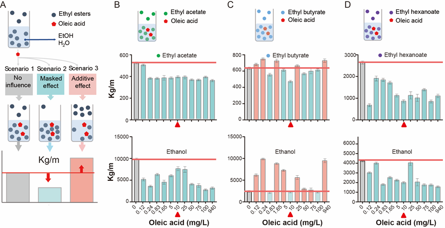 添加油酸会抑制乙酸乙酯、己酸乙酯挥发,kg/m分别降低4%-31%和27%-74%,相反地,丁酸乙酯和其他分子间的吸引力因油酸的添加而降低,其挥发被促进,kg/m增加,940mg/L油酸添加量时察觉阈值由0.36 mg/L降至0.05 mg/L。