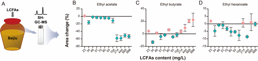 向浓香型、酱香型白酒中分别额外添加LCFAs至含量为原酒中其总量的2.5~10倍时,发现分别有约73%和87%的挥发性化合物面积变化率为负数,绝大多数化合物的挥发受到抑制;至2.5~95倍时发现,乙酸乙酯几乎均被抑制,己酸乙酯易被抑制(响应面积改变率为−13.9%~ 1.9%),但是丁酸乙酯的挥发被促进(−13.3%~ 20.6%)。