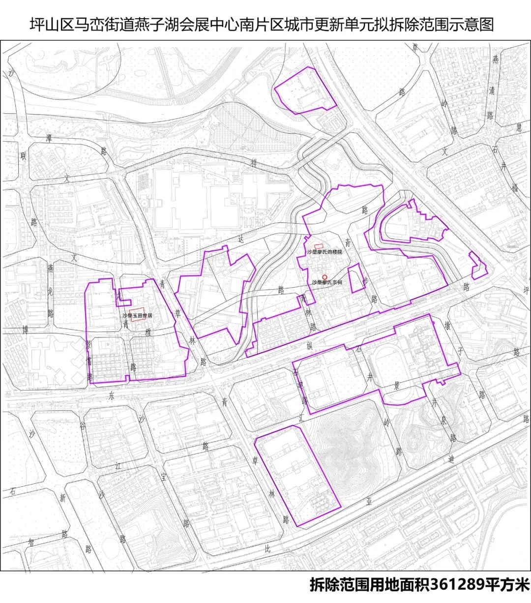 燕子湖会展中心南片区城市更新单元申报主体为深圳市坪山沙壆股份合作公司,拆除范围用地面积361289平方米,拟更新方向为居住、商业等功能; 拟拆除重建用地范围内应落实用地面积不小于128019平方米的城市基础设施、公共服务设施等公共利益用地;其中应落实用地面积不小于48389平方米的教育设施用地、用地面积不小于27803平方米的公园绿地和不小于4414平方米的文体设施用地;更新单元计划有效期2年,自2023年11月9日起至2025年11月8日止。