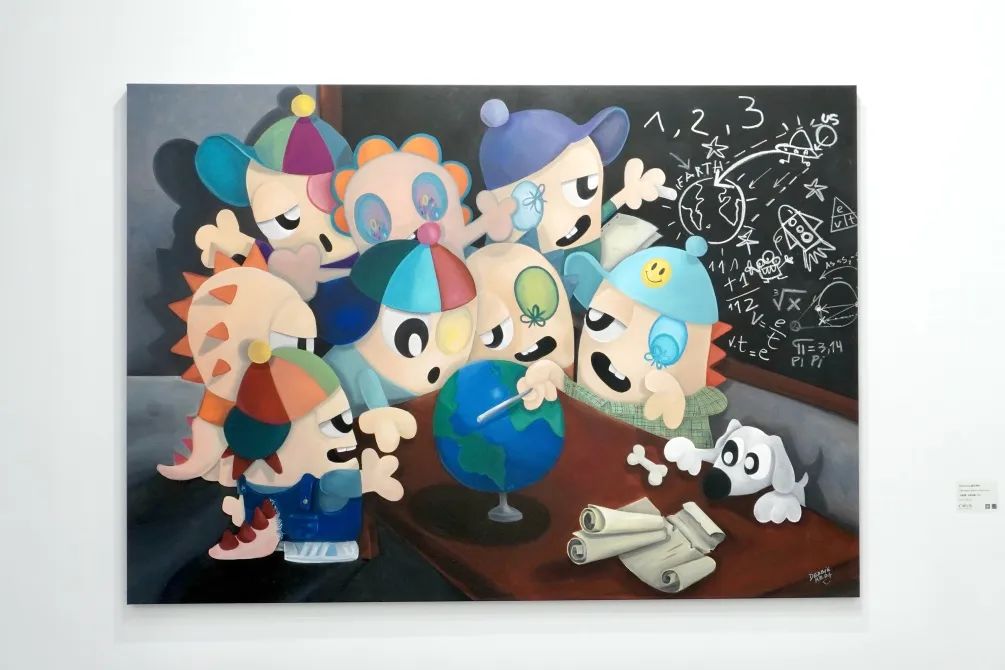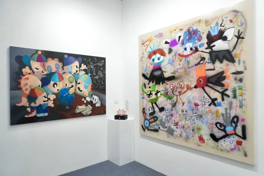 亚当·汉德勒(Adam Handler)在本次展会上依旧带来了他标志性的女孩与小幽灵《甜瓜天空下的尖叫蒜头女孩和幽灵》(Screaming Onion Head Girl and Ghost under a Melon Sky)——斑斓色彩与随性笔触带来的冲击力,在大尺幅的画布上得以凸现;黛比·瑞达(Debbie Reda)也为展会专门绘制了大幅画作《行星课》(The Planet Lesson),艺术家一改平日亮色背景的风格,以黑色背景展现一场趣味横生的小怪兽讨论场景,将好奇氛围与诙谐感融为一体。