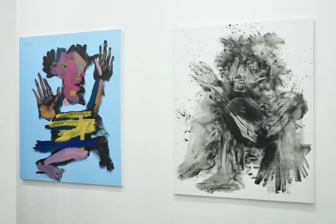 哈维·卡波内(Xavi Carbonell)的参展作品也是2023年的新作,延续其一贯的涂鸦风格,物体在画面中的大小和颜色对比更加两极化,但又在冲突中保持着微妙的平衡;呈现类似微妙矛盾的,还有胡安·米格尔·帕拉西奥斯(Juan Miguel Palacios)的作品《变体-20》(Variations-XX),颜料笔触飞溅于虚空中,但厚度与阴影又给予了其穿越于平面与现实间的能力,抽象元素的身份在这一刻变得多元。