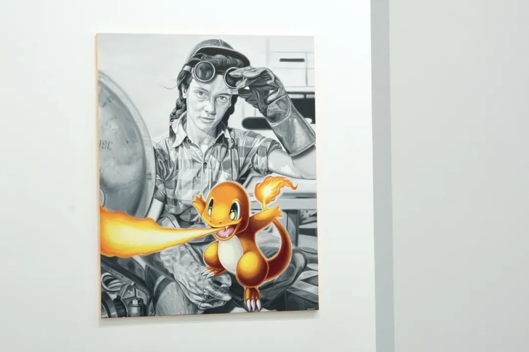 艺术家雅各布·维拉托(Jacob Vilató)也亲临展会现场,携其经典系列“静坐的男人”(Homme Assis),为观众展现静坐一刻下暗涌的思绪:强对比的色彩和黑白水墨般的质感营造出不同的气场,但毫无疑问,行动与思考的力量皆汇聚于此,震慑心魄。关于黑白与色彩的碰撞,亦不能错过杰米·桑格罗(Jaime Sancorlo)的作品《升温》(Heat Up)和《云朵突袭》(Air Raid)。以旧照片为底色,加入如小火龙和马里奥等令人耳熟能详的彩色卡通元素,艺术家对战争的反思极易引发观者的共鸣,令人欢笑,亦引人深究。