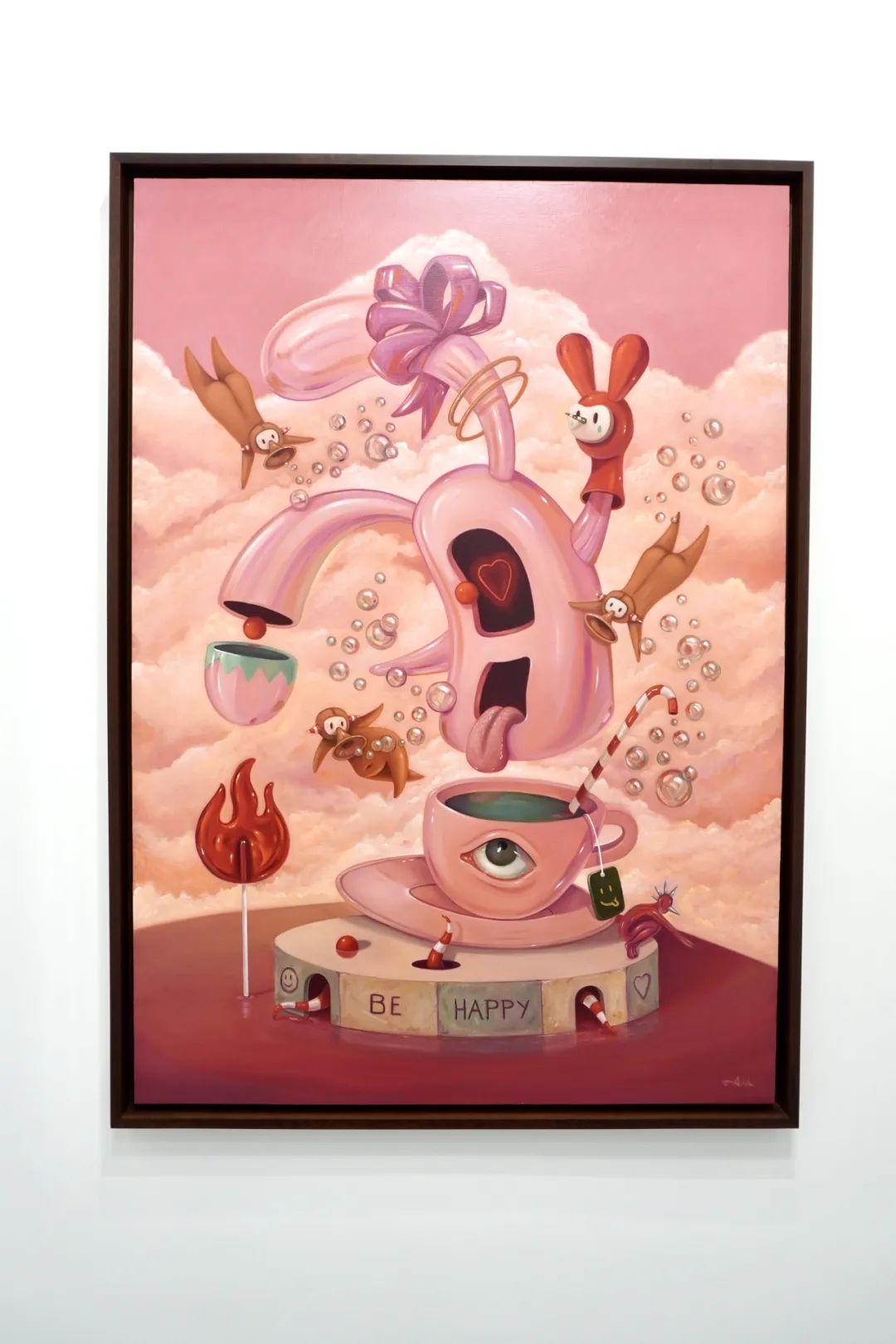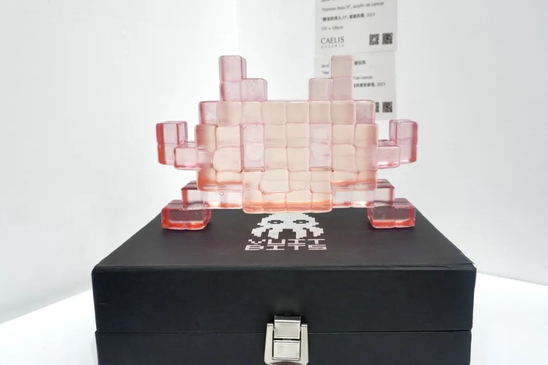 恪理画廊还展出了阿罗尔(Arol)的新作《保持快乐》(Be Happy)。粉色剧场中充斥着梦幻的泡沫和飞舞的精灵,火焰状糖果和蓝色茶饮为这场庆典抹上了更为惬意的滋味。置身于画前,快乐让人止步、沉沦。八进制(Vuitbits)的雕塑作品《太空入侵者》系列(Space Invader)和《看看我的脸》(Look At My Face)也在展出之列。透明树脂使像素格变为现实雕塑,柔化了数字的冰冷感,作品的俏皮惹人玩味。