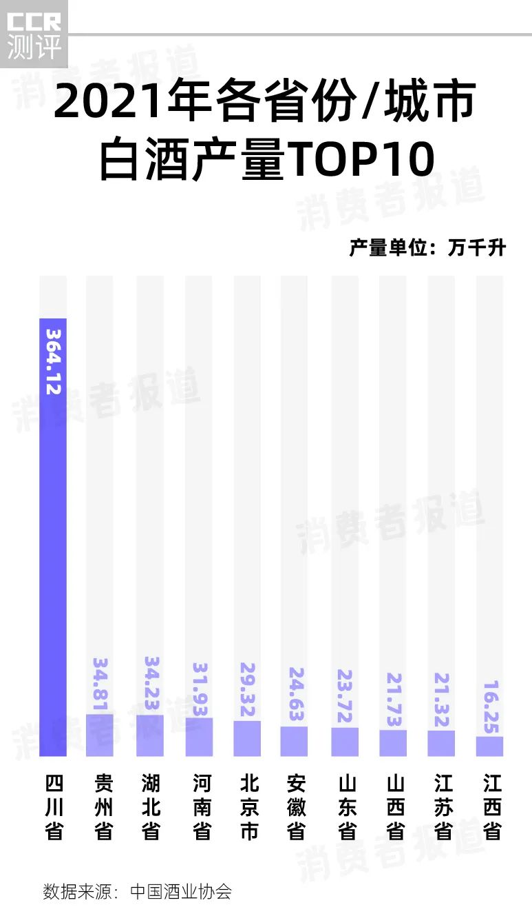 根据数据显示,2021年,全国规模以上白酒企业累计完成销售收入6033.48亿元,占中国规上酒类企业总销售收入的69.5%。其中,四川以364.12万升的年产量遥遥领先,占总产量的51.60%,成为中国白酒产量最大的省份。贵州、湖北、河南三省分别以34.81万千升、34.23万千升、31.93万千升的产量位列第二、第三、第四位。