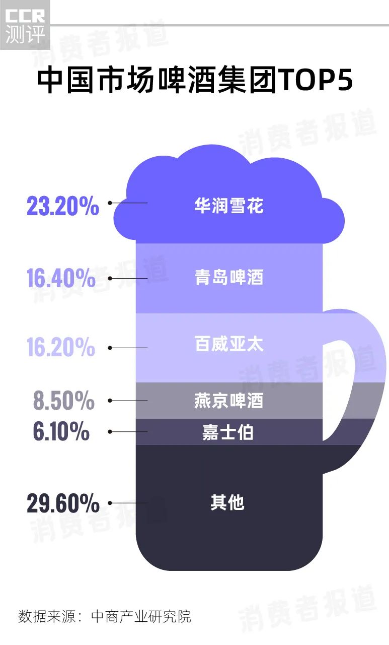 2021年,国产啤酒产量为3562.43万千升,规模以上啤酒企业累计完成销售收入1584.80亿元。华润雪花、青岛啤酒、百威英博、燕京啤酒以及嘉士伯,这5大啤酒集团占据了70%以上的市场份额。