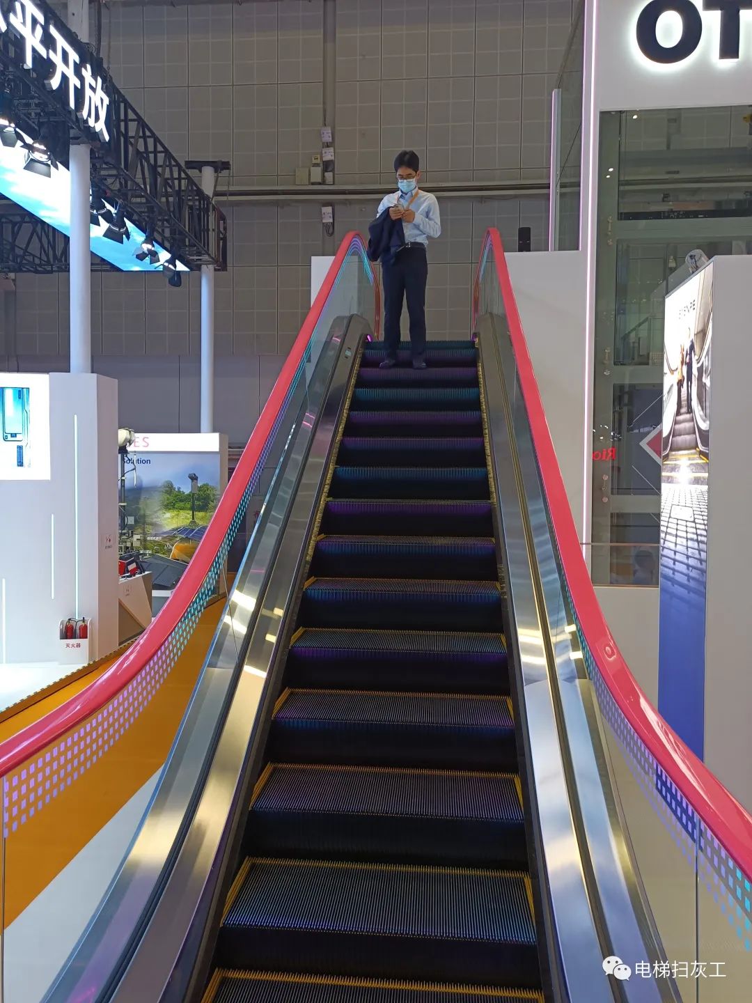 奥的斯本届进博会展出了其新款全数字化的Gen360产品,虽然这款产品正式向国内市场开房并签约了第一个中国客户,不过遗憾的是相比欧美款,其最大特色电梯轿厢内维修平台并没有引进中国市场。另外奥的斯还带来了更美观和环保的自动扶梯,主要是方向灯做了嵌入式设计,另外加装了扶手带自动清洁系统,可以保持扶手带更加美观和环境友好。