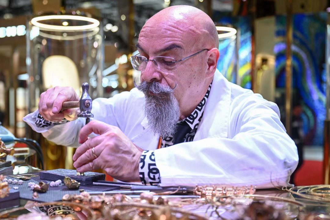 熟悉杜嘉班纳的人都知道,DEVOTION是“老朋友”了。此次进博会金匠以金银丝细工、浮雕、凿刻等高超的珠宝加工工艺塑造栩栩如生的玫瑰,皮具艺匠在现场打造带有“Devotion for CIIE”印记的进博会特别版DEVOTION手袋。