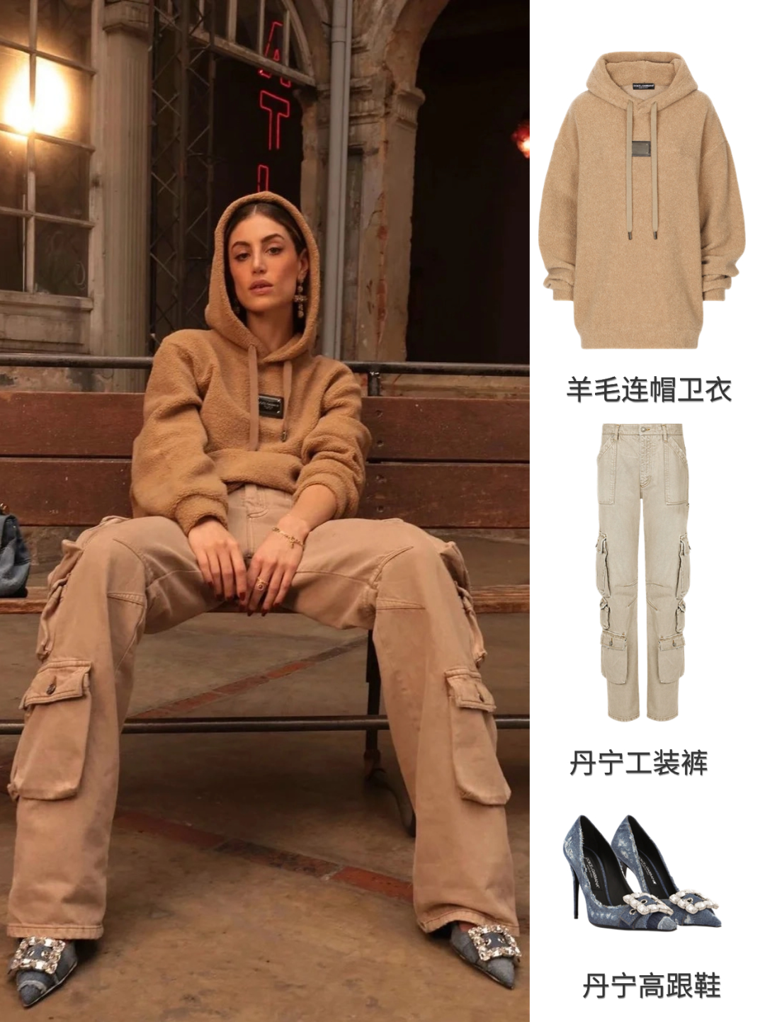 驼色是杜嘉班纳秋冬季节的经典元素。驼色羊毛连帽卫衣搭配丹宁牛仔裤正适合当下季节。