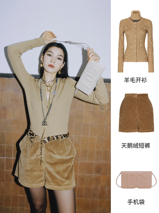 羊毛与羊绒材质的毛衣开衫柔软又舒适,搭配天鹅绒短裤,这一套算是给冬日的时尚感穿搭给拿捏了。