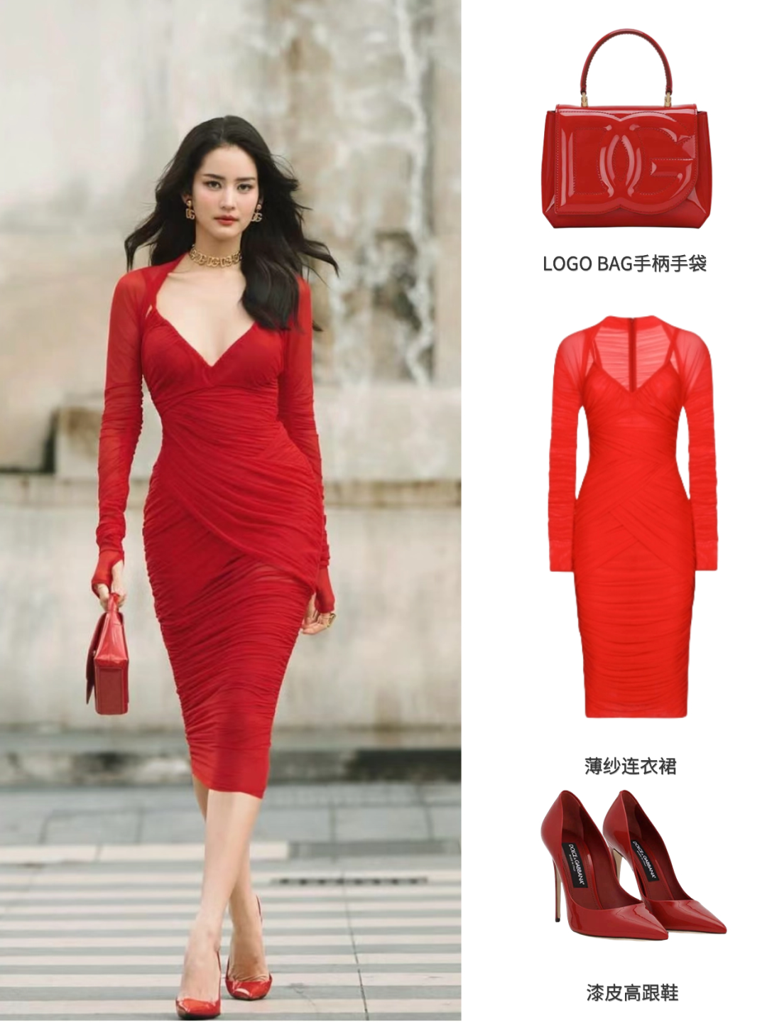 红色薄纱连衣裙热情火辣,搭配火热红色的LOGO BAG手柄手袋和漆皮高跟鞋颂扬感性真谛。
