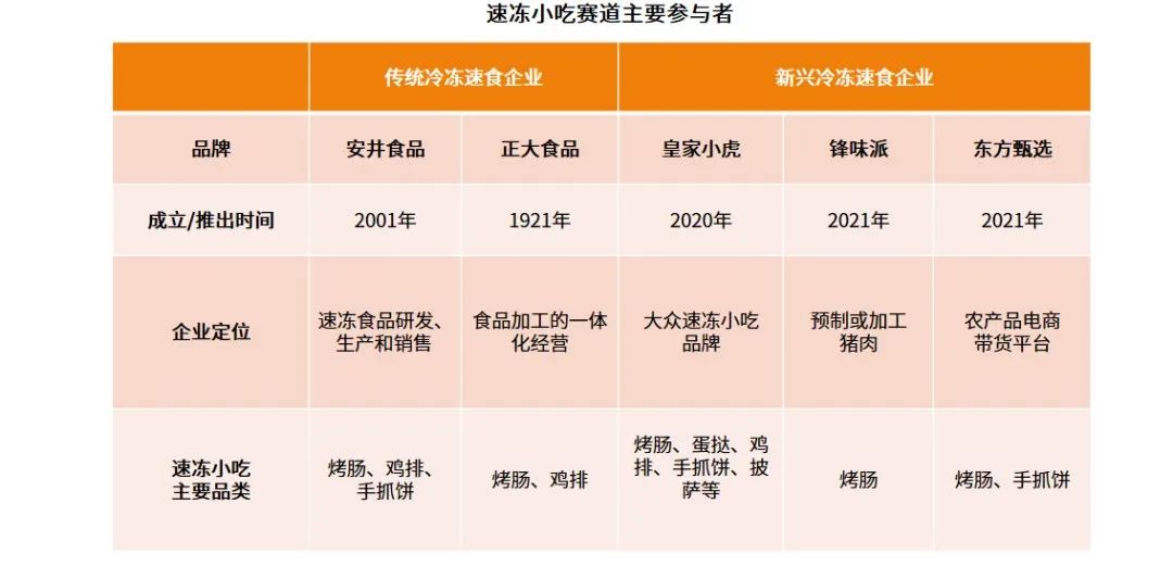 当前速冻小吃市场的竞争参与者除了安井、正大食品这一类传统的冷冻食品企业外,还包括如皇家小虎等专注于速冻小吃细分市场的企业。