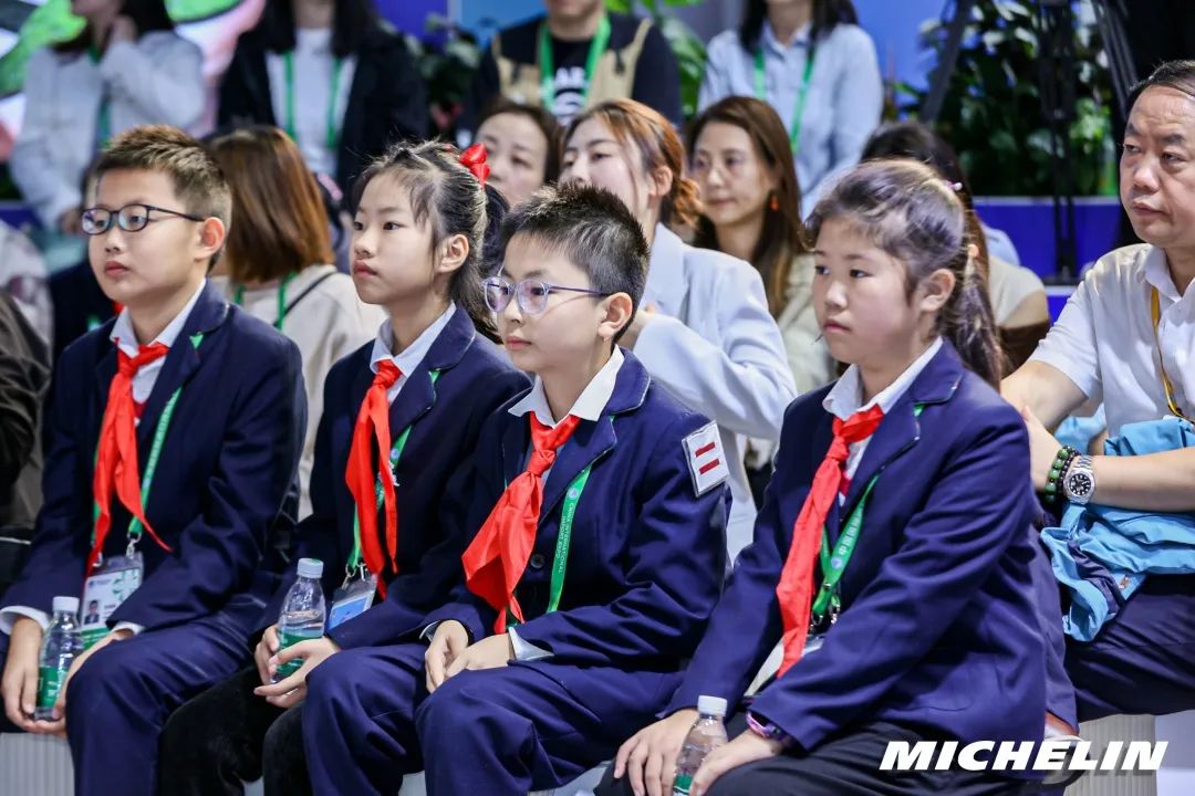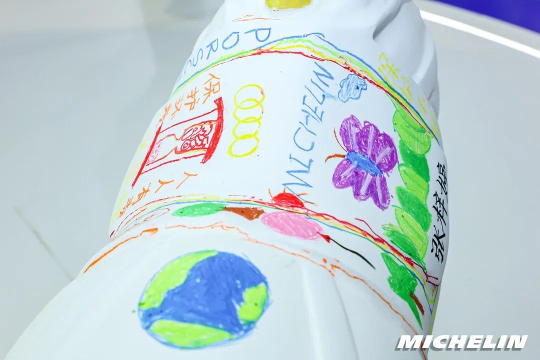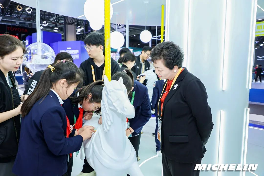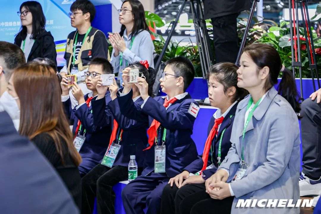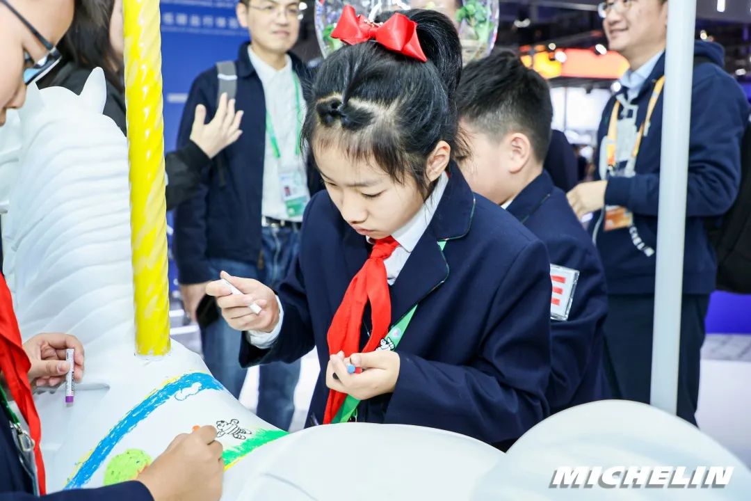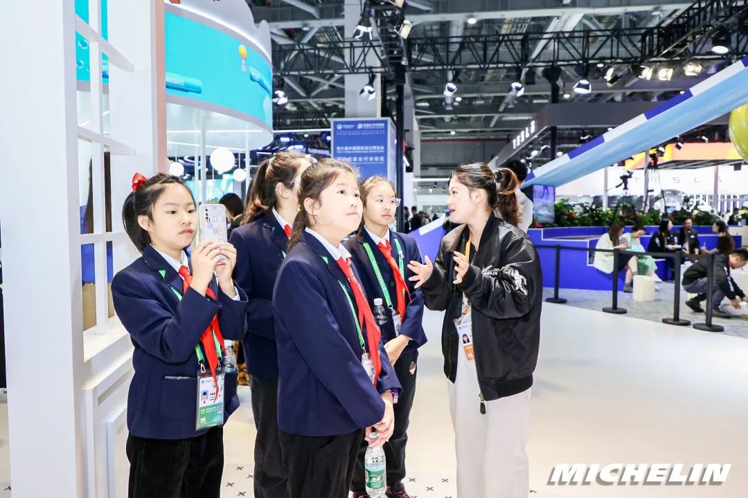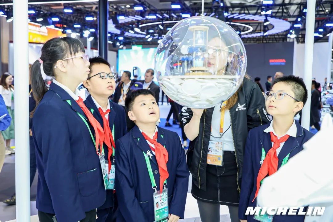 来到“米其林”展区,孩子们被低碳、可循环使用的各类环保制品所吸引。在工作人员的讲解下,同学们领略了智能制造的科技魅力,原来橘子皮,稻谷壳、竹子都是可以提炼出可持续材料,生产出赛车的轮胎。