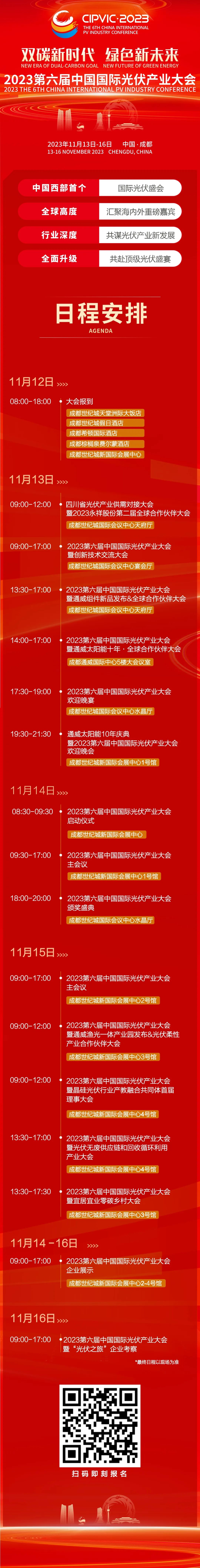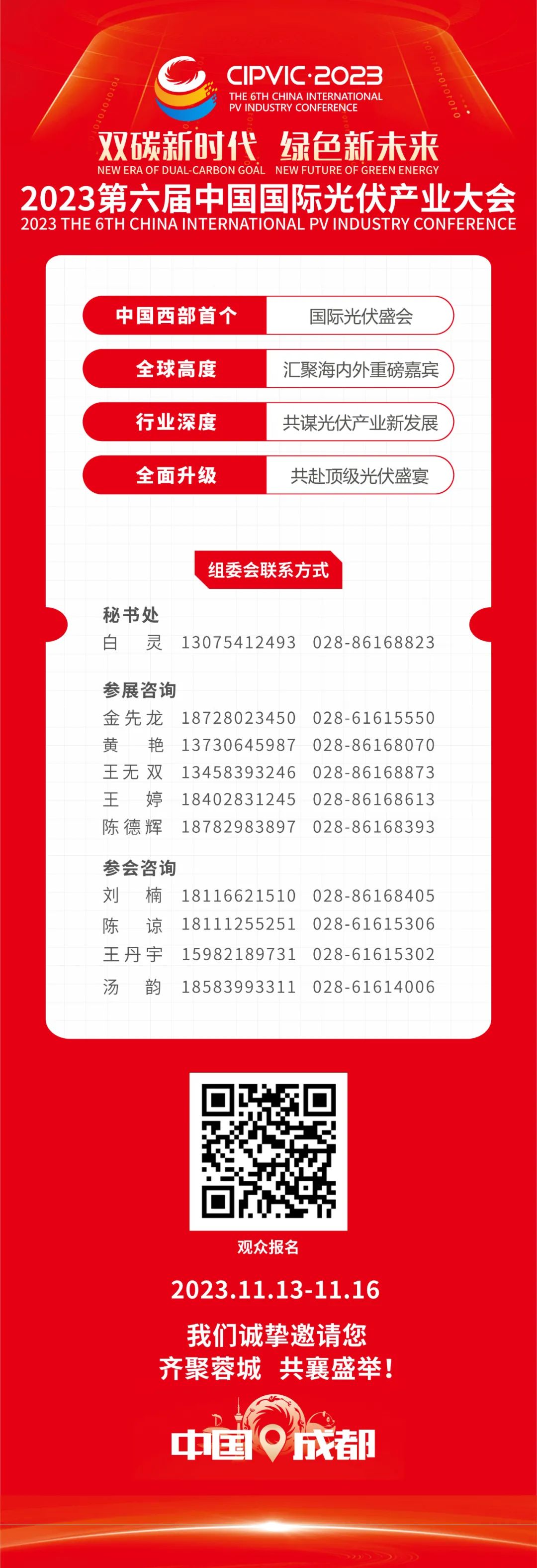 11月13-16日,2023第六届中国国际光伏产业大会将在四川成都隆重举行。作为我国西部首个国际光伏盛会,届时海内外重要领导、重磅嘉宾、行业大咖及全球光伏行业龙头企业将齐聚一堂,共话绿色低碳新未来!目前,大会日程已出炉,精彩纷呈的活动即将逐一呈现,敬请期待!点击上方二维码,即刻报名参与!