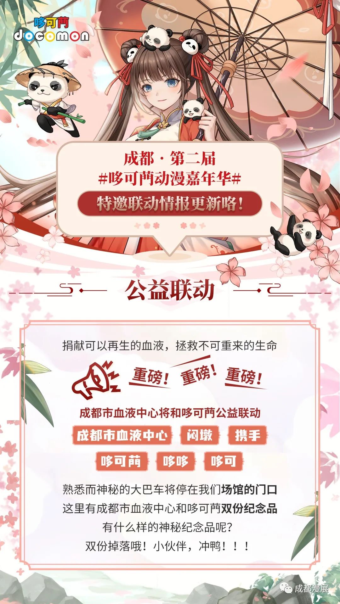 哆可菛特邀 #成都市血液中心# 进行重磅联动!!!将公益进行到底!届时将会有成都市血液中心的献血大巴车停靠于场馆门口,参与公益的小伙伴将会有双份纪念品可领取,献一份之爱心,救他人之性命。