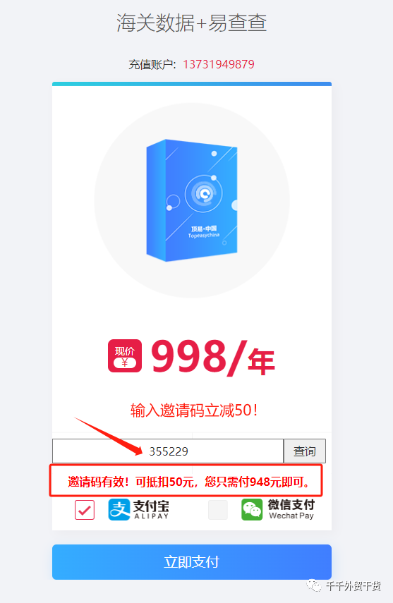 进入海关数据活动链接,输入券码355229 立减50,仅需948一年