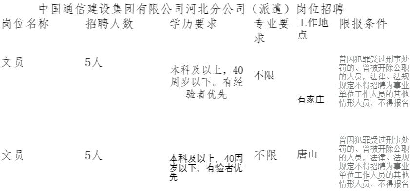 一、企业介绍: 中国通信建设集团有限公司(简称中国通建,英文简称CITCC)是由原中国通信建设总公司公司制改建成立,中国通建是我国通信建设领域规模较大、施工能力较强、科技含量较高的大型信息服务施工企业。 具有开发海外业务职能,拥有外经、外贸经营权、劳务进出口权和执行国家对外经援任务及政府间合作任务的中国通信走向世界的“窗口”企业之一。其全资子公司北京诚公管理咨询有限公司目前因业务拓展需要招聘工作人员。 二、招聘岗位:
