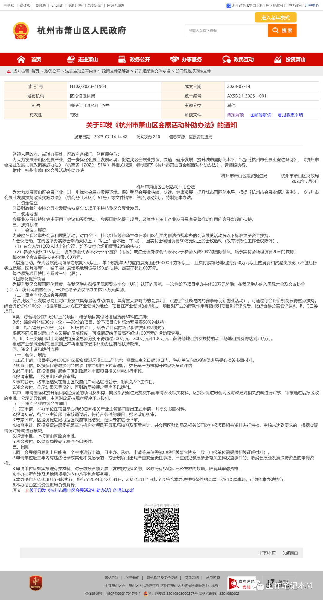 为大力发展萧山区会展产业,进一步优化会展业发展环境,促进我区会展业持续、快速、健康发展,提升城市国际化水平,特制定本办法。为鼓励在我区举办会议和展览活动,对由企业、社会组织等市场主体在萧山区范围内依法依规举办的会议展览活动按以下标准给予资金扶持:1.会议活动。在我区举办实际会期两天以上(“以上”含本数,下同),且实付会场租赁费50万元以上的会议活动(政府行政性工作会议除外)。(1)参会人数1000人以上的会议,给予实付会场租赁费20%的扶持;(2)参会人数500人以上,境外参会代表不少于5个国家(地区)或注册境外参会代表不少于参会人数20%的国际会议,给予实付会场租赁费20%的扶持;2.展览活动。在我区展览场馆举办展期3天以上,单个展览单天的室内展览面积10000平方米以上,且实付展馆场地租赁费50万元以上的消费和贸易类展览(不包括各类成就展、图片展等),给予实付展馆场地租赁费15%的扶持,最高不超过60万元。3.国际化提升项目。为提升我区会展国际化程度,在我区举办获得国际展览业协会(UFI)认证的展览,一次性给予项目举办主体30万元奖励;在我区举办纳入国际大会及会议协会(ICCA)统计范围的会议,一次性给予会议举办主体15万元奖励。 符合我区产业发展导向且对产业发展具有显著推动作用、具有重大影响力的会展项目(包括产业领域内的赛事等创新创业活动),可通过综合评价机制获得重点扶持。综合评价总分100分,根据项目主办方在产业领域的地位、项目在产业领域的影响力、项目对产业的带动作用等指标对项目进行评价后,按综合得分高低评选A、B、C三类项目。A类:综合得分在90分以上的项目,给予项目实付场地租赁费60%的扶持;B类:综合得分在80分(含)—90分的项目,给予项目实付场地租赁费50%的扶持;C类:综合得分在70分(含)—80分的项目,给予项目实付场地租赁费40%的扶持。根据不同项目对萧山产业发展的贡献程度,可视情况给予最高不超过100万元的活动配套费。A、B、C三类项目以上两项扶持资金总额分别不得超过300万元、200万元和100万元,获得场地租赁费扶持的项目场地租赁费需达到50万元。重点产业领域会展项目原则上不再重复享受本补助办法其他扶持政策。1.正式申请。项目举办前30日向区投资促进局提出正式申请;项目结束之日起30日内,举办单位向区投资促进局提交相关书面材料。2.核查评估。区投资促进局接到会展项目举办单位正式申请后,委托第三方机构开展现场核查评估。3.部门审核。区投资促进局会同区财政局对申报项目相关材料进行审核。5.事前公示。将审批结果在萧山区政府门户网站进行公示,时间为5个工作日。6.资金拨付。公示结果无异议的,区财政局按规定程序予以拨付。其中,申请国际化提升项目奖励资金的项目及机构,向区投资促进局提交书面申请表及相关材料。区投资促进局会同区财政局对相关资料进行审核,审核通过后报区政府审批,公示无异议后,由区财政局按规定程序予以拨付。1.书面申请。举办单位在项目举办前60日向相关产业主管部门提出正式申请,并提交书面材料。2.报请初审。各产业主管部门审核通过后,将符合条件的项目上报区政府初审。3.专家评审。区投资促进局根据区政府审批结果,组织专家进行评审。4.核查审计。区投资促进局委托第三方机构对项目开展现场核查及事后审计,并会同区财政局及相关部门对申报项目相关资料进行审核。审核未达到要求的,根据实际情况对补助进行核减。本办法自2023年8月6日起执行,施行至2024年12月31日。2023年1月1日起至今符合本办法扶持条件的会展活动和会展事项,可参照本办法执行。