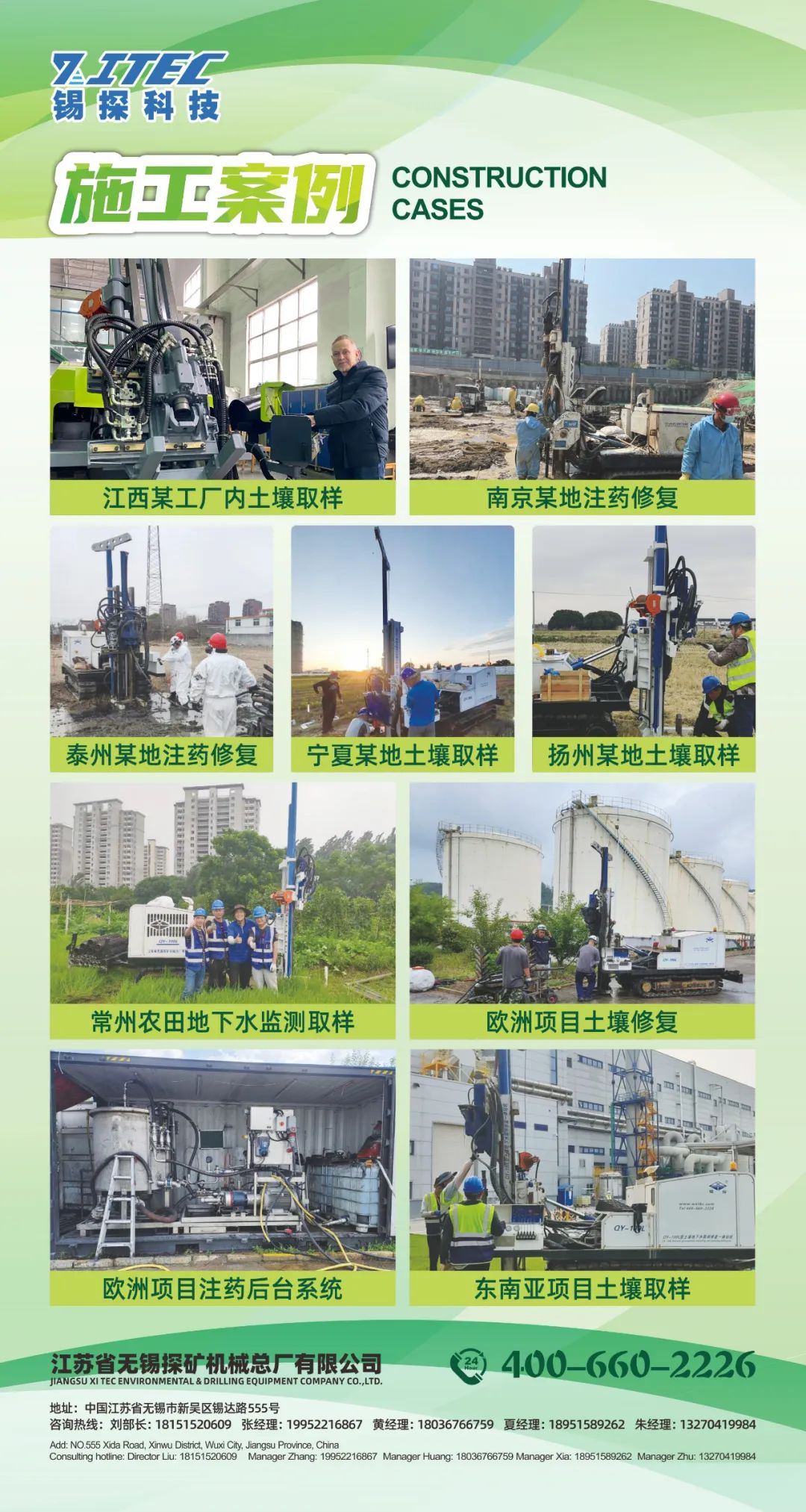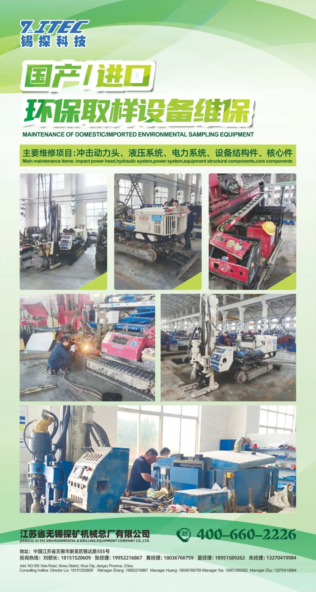 锡探科技是一家集科研、设计、生产、销售、服务于一体的高端设备制造企业,产品覆盖锚固、旋喷、工程勘探等系列桩工设备及钻具,广泛应用于各种探矿工程及工民建等基础工程,用于地质灾害治理以及污染土壤、地下水的取样和治理等。