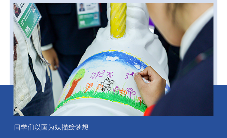 值得一提的是,在米其林的追逐过程中,我们也积极践行全新的企业社会责任战略,着眼于安全、环境、平等三大领域的发展。今年进博会的现场,米其林将结对学校江川路双江小学的师生代表邀请到现场,通过现场参观和趣味互动,共同畅想了大家追逐的美好未来。孩子们还通过富有想象力的画笔,为“明日之境”的三匹木马绘就了五彩马鞍,传递出他们对于绿色可持续未来的美好愿望。