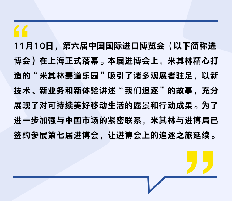 虽然进博展会只有短短6天,但“追逐”永无止境。面向未来,米其林将继续深耕中国市场,以创新驱动品牌发展,为人们带来更加美好的生活体验。